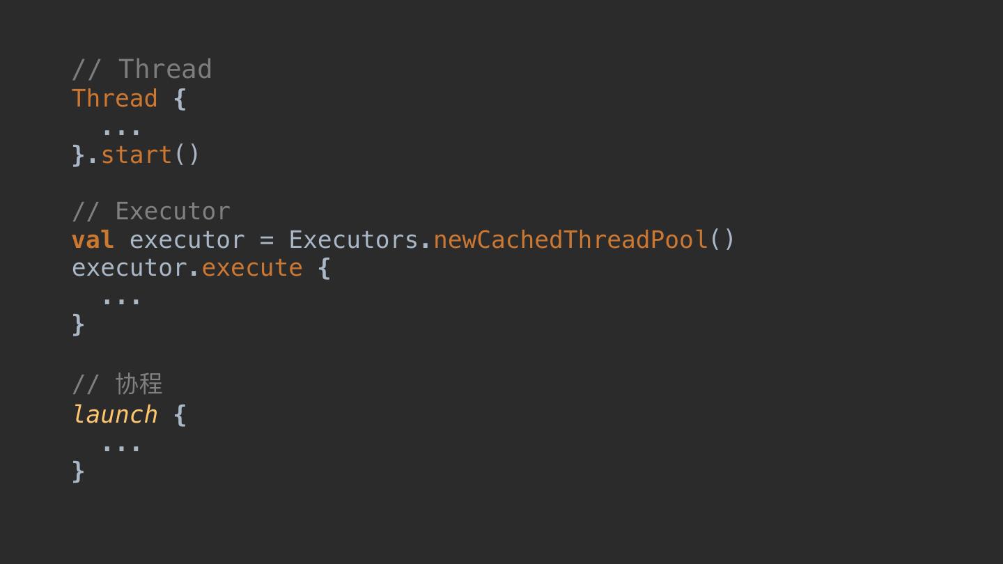 9 .// Thread Thread { ... }.start() // Executor val executor = Executors.newCachedThreadPool() executor.execute { ... } // 协程 launch { ... }