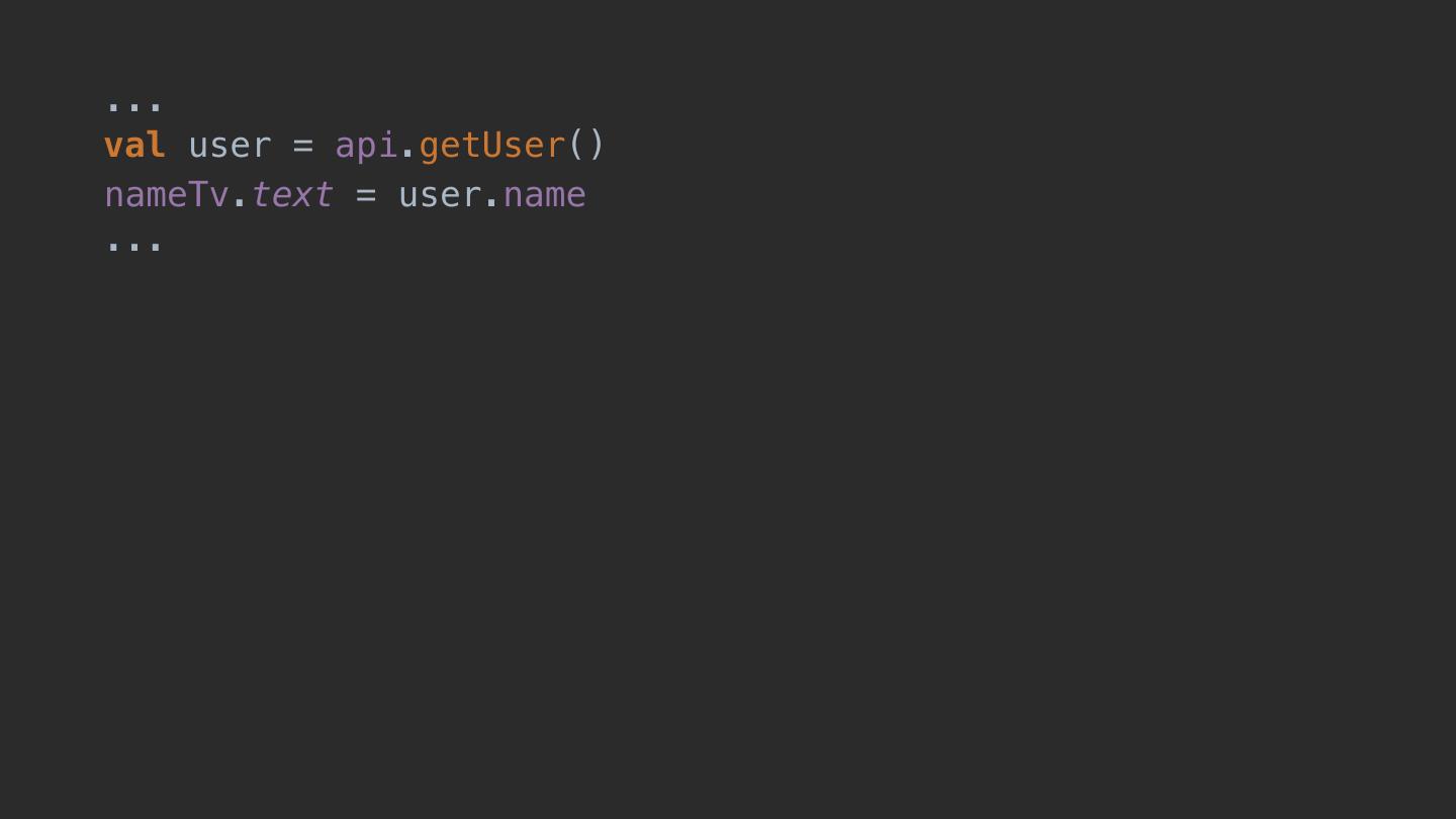 12 .... val user = api.getUser() nameTv.text = user.name ...