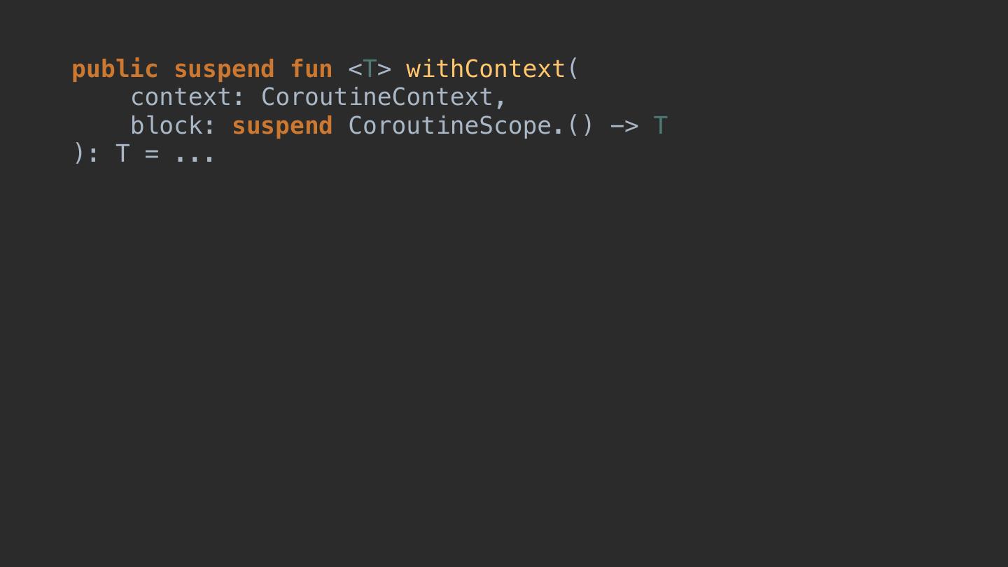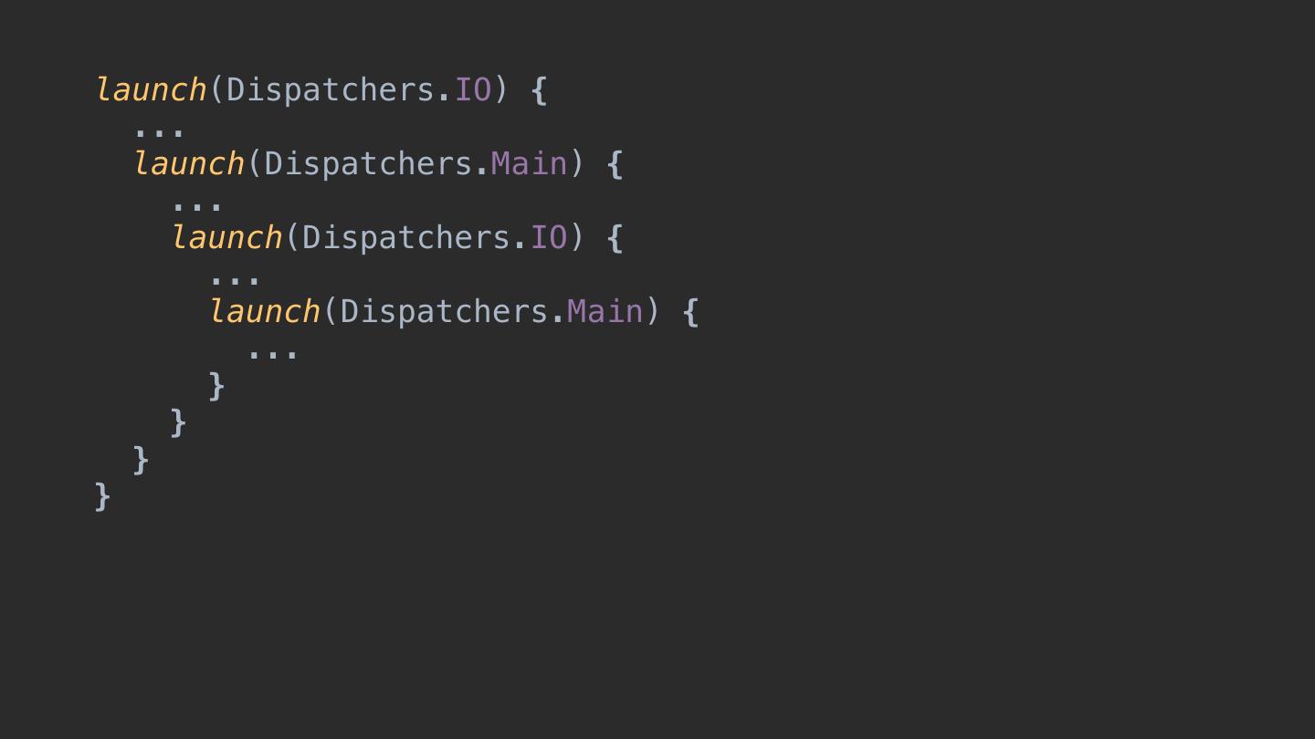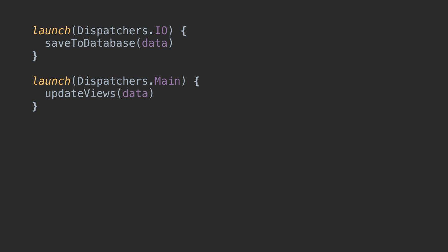 19 .launch(Dispatchers.IO) { saveToDatabase(data) } launch(Dispatchers.Main) { updateViews(data) } thread { ... }