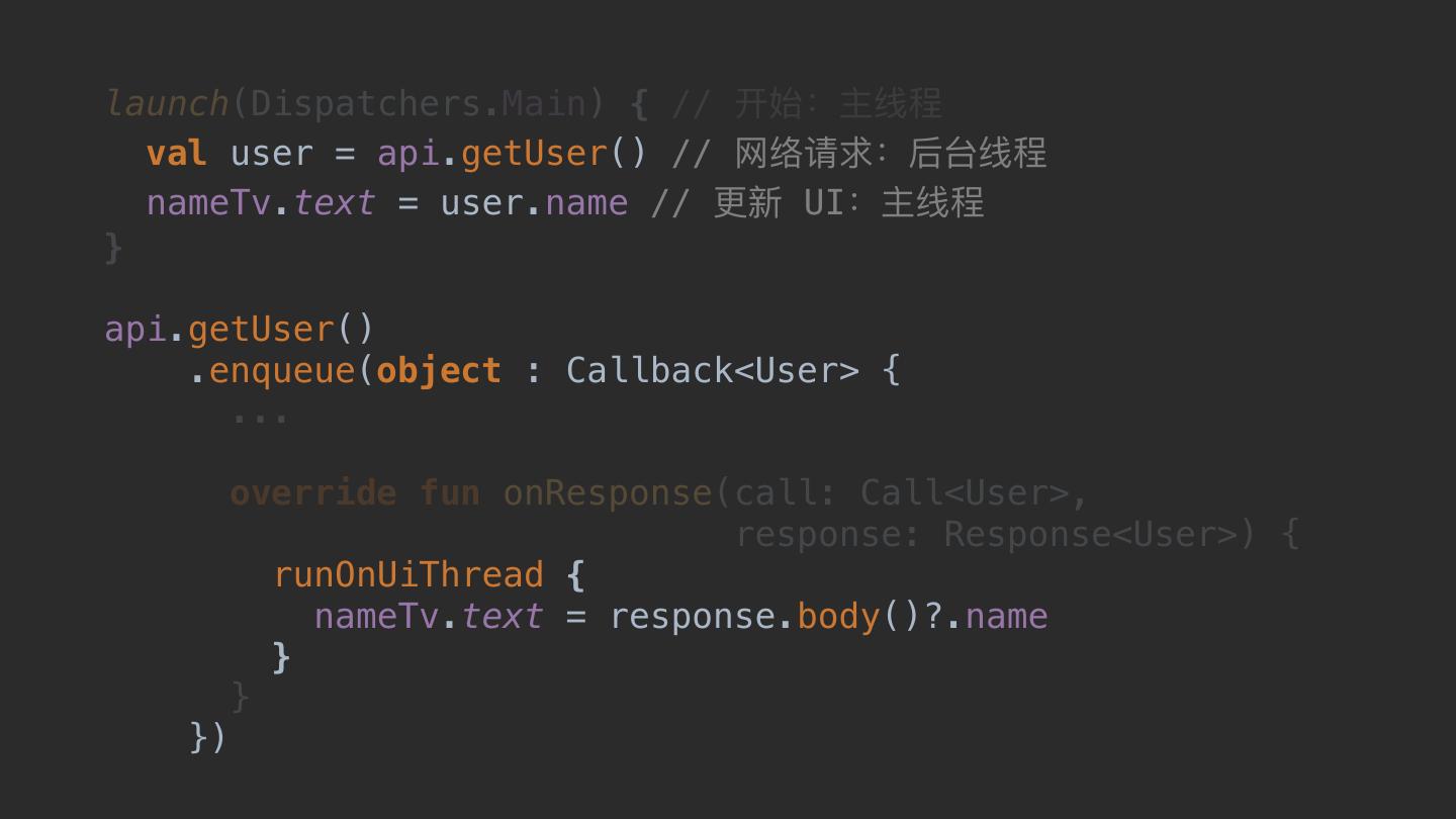 23 .launch(Dispatchers.Main) { // 开始:主线程 val user = api.getUser() // ⽹网络请求:后台线程 nameTv.text = user.name // 更更新 UI:主线程 } api.getUser() .enqueue(object : Callback<User> { ... override fun onResponse(call: Call<User>, response: Response<User>) { runOnUiThread { nameTv.text = response.body()?.name } } })