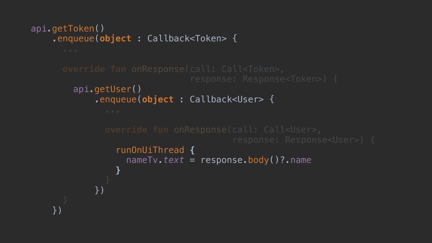 28 .api.getToken() .enqueue(object : Callback<Token> { ... override fun onResponse(call: Call<Token>, response: Response<Token>) { api.getUser() .enqueue(object : Callback<User> { ... override fun onResponse(call: Call<User>, response: Response<User>) { runOnUiThread { nameTv.text = response.body()?.name } } }) } })