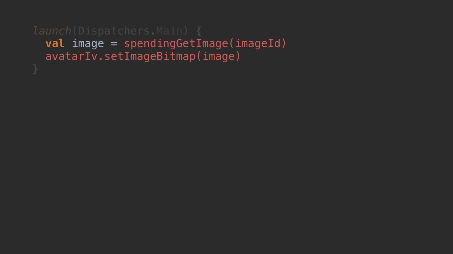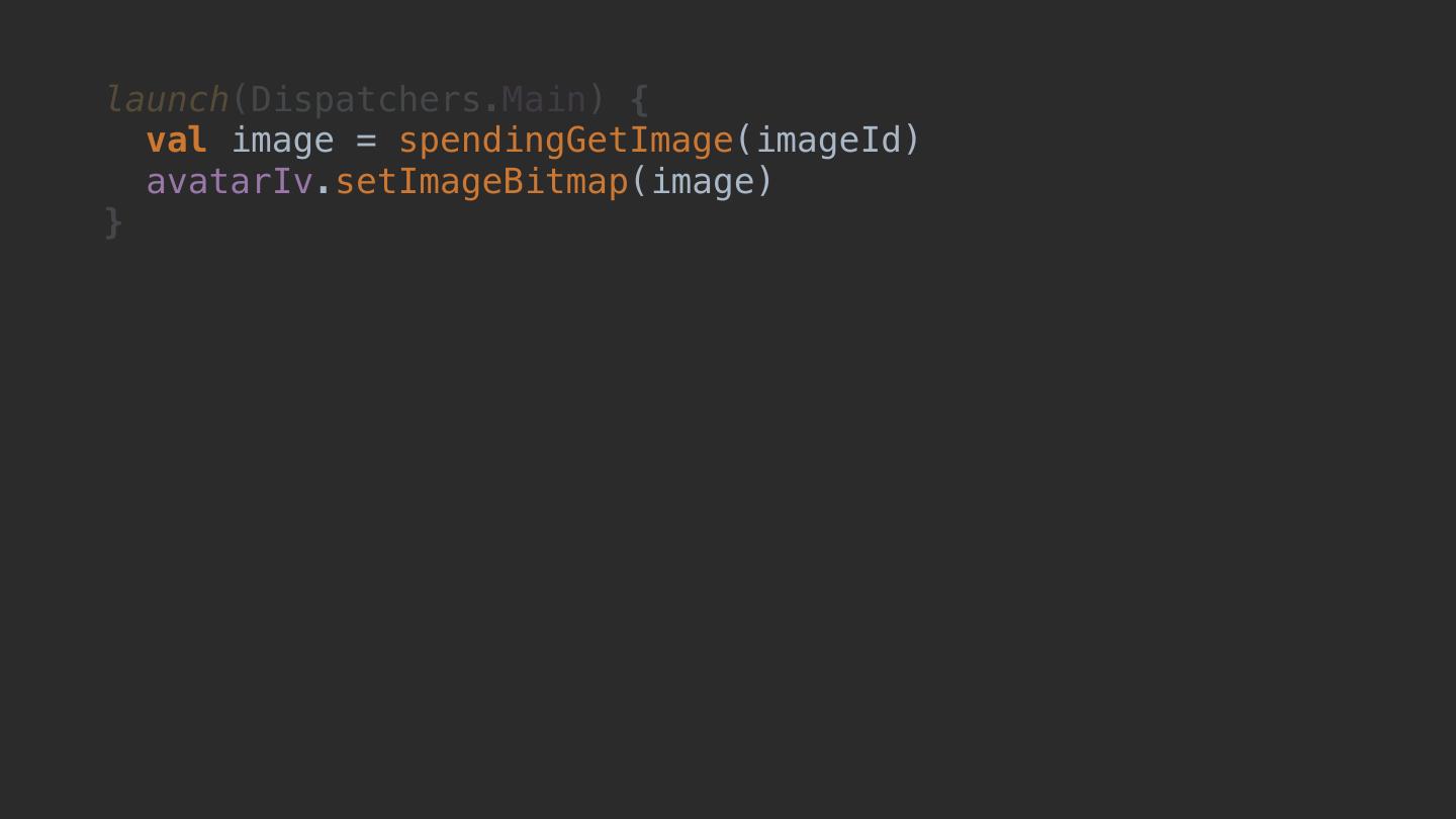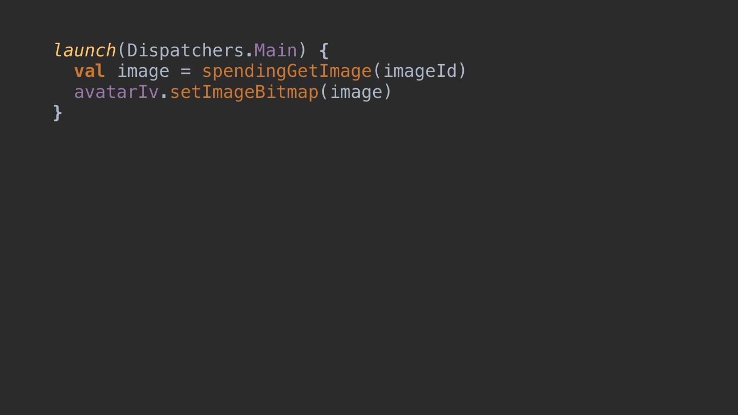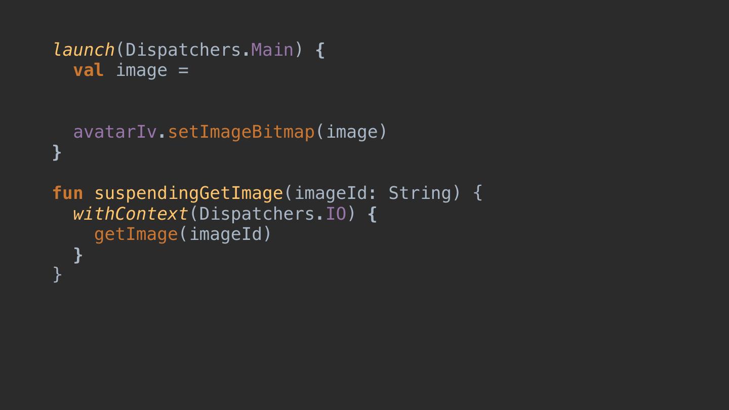 25 .launch(Dispatchers.Main) { val token = api.getToken() val user = api.getUser(token) nameTv.text = user.name }