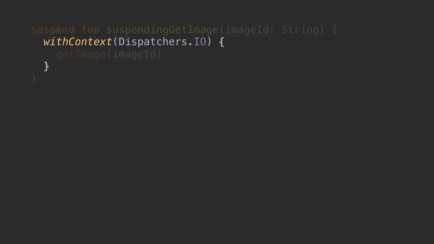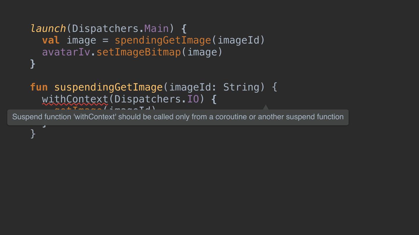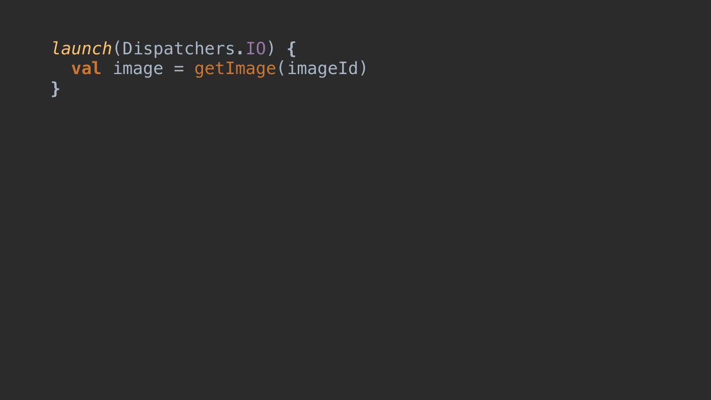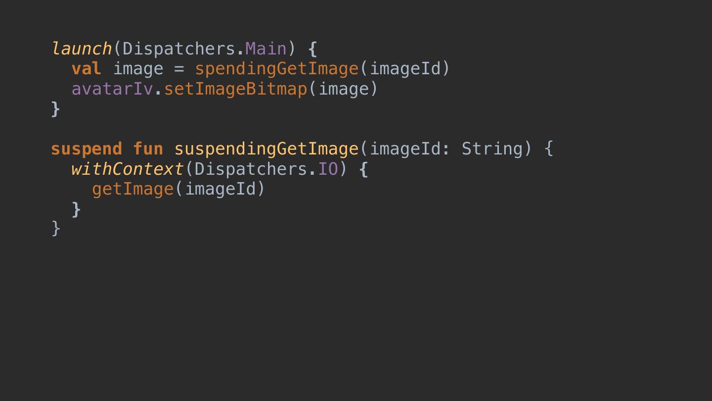 25 .launch(Dispatchers.Main) { val token = api.getToken() val user = api.getUser(token) nameTv.text = user.name }