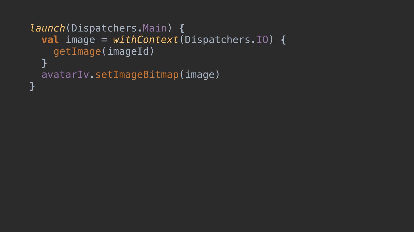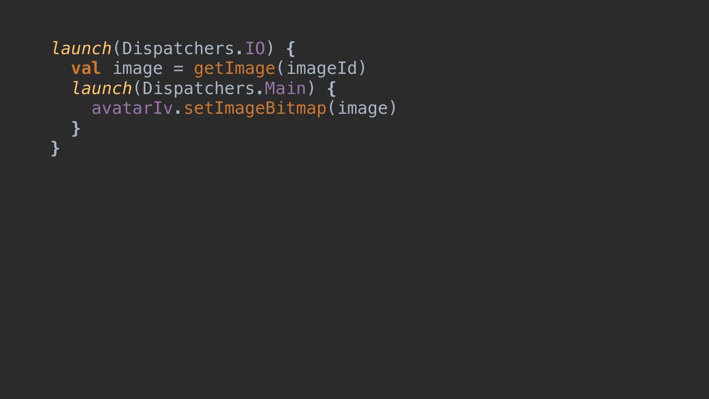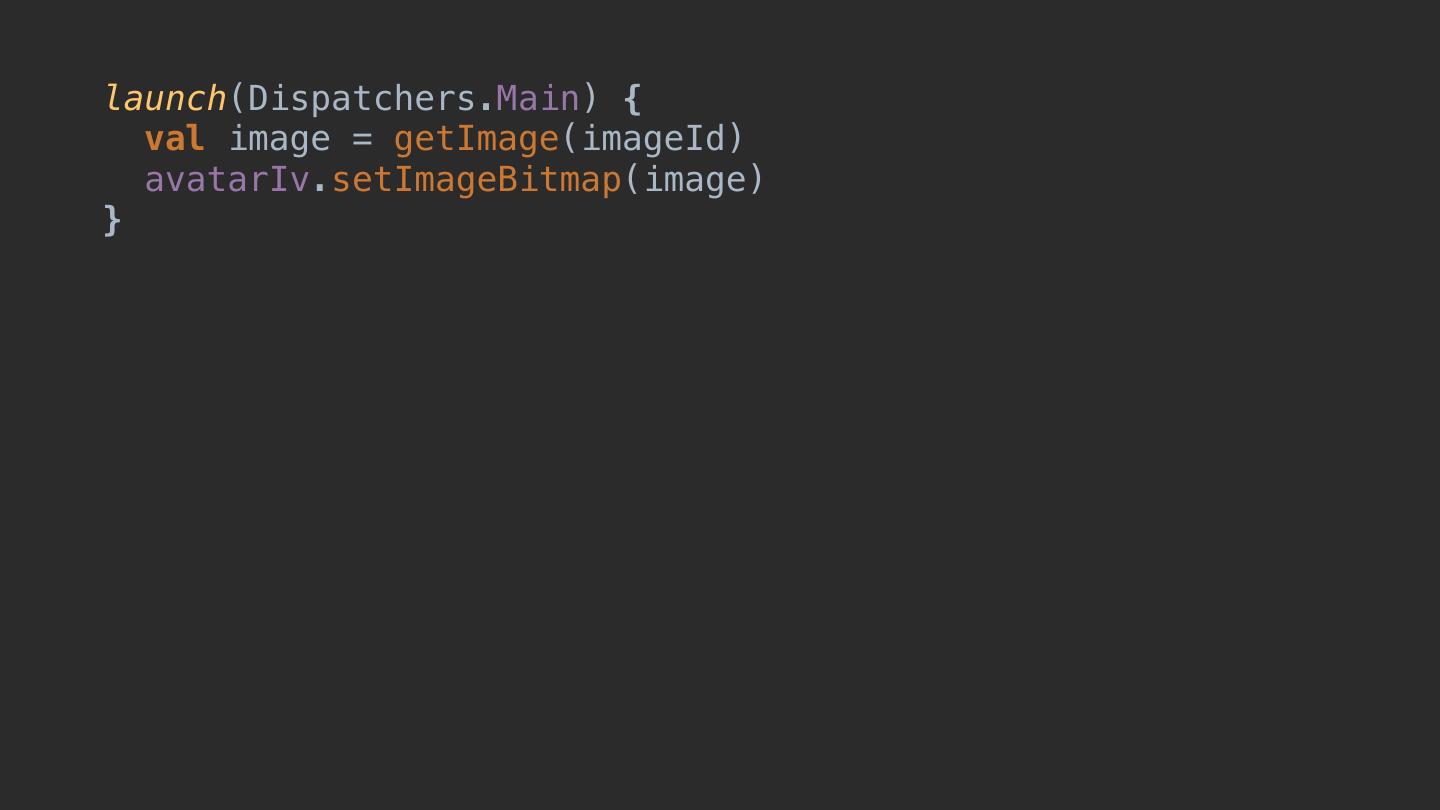 20 .launch(Dispatchers.Main) { val user = api.getUser() nameTv.text = user.name }