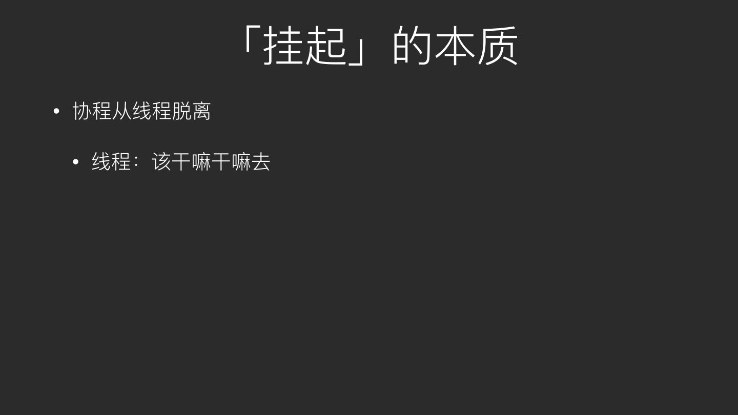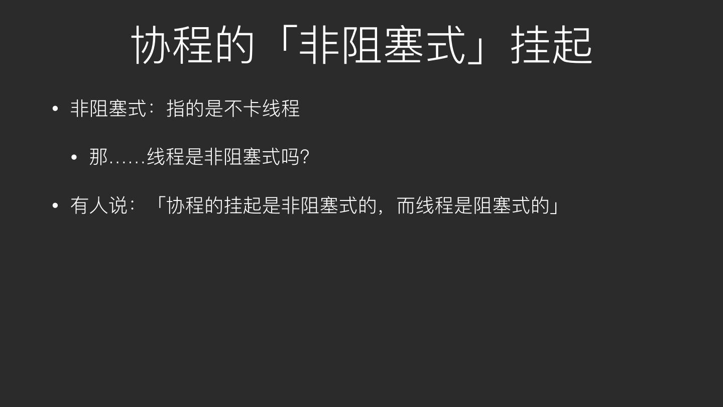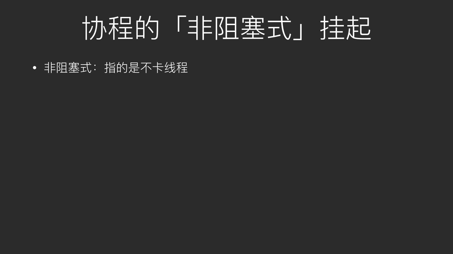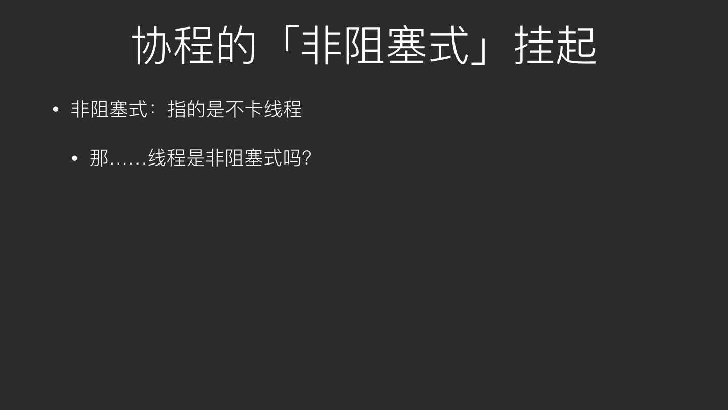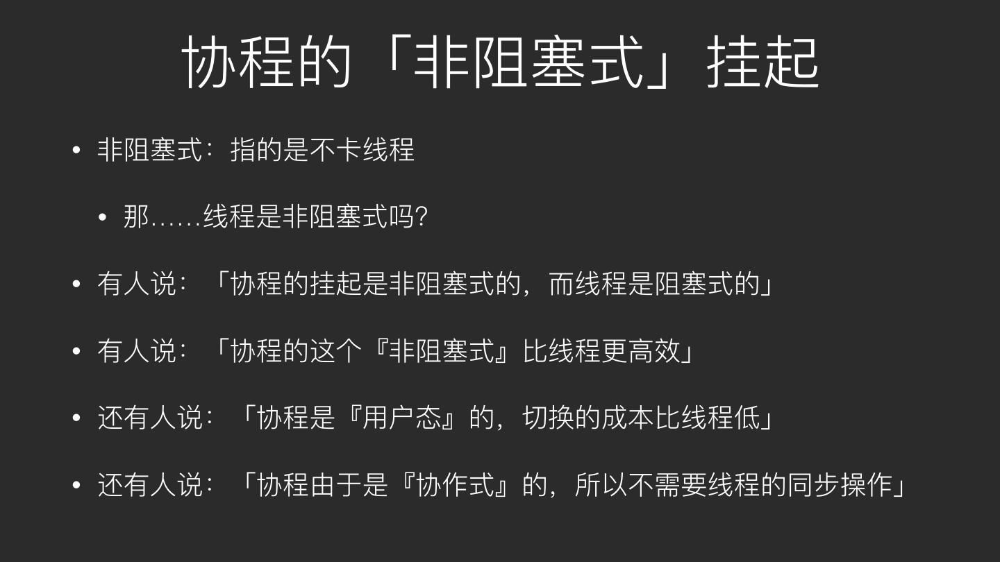 4 . 在⽹网上搜「协程是什什么」 • 「协程和线程类似,是⼀一种在程序开发中处理理多任务的组件。」 • 「协程就像⼀一种轻量量级的线程。」 • 「协程很像线程,但它不不是线程。」 • 「协程是『⽤用户态』的,它的切换不不需要和操作系统交互,因此协程 切换的成本⽐比线程切换低。」 • 「协程由于是『协作式』的,所以不不需要线程的同步操作。」
