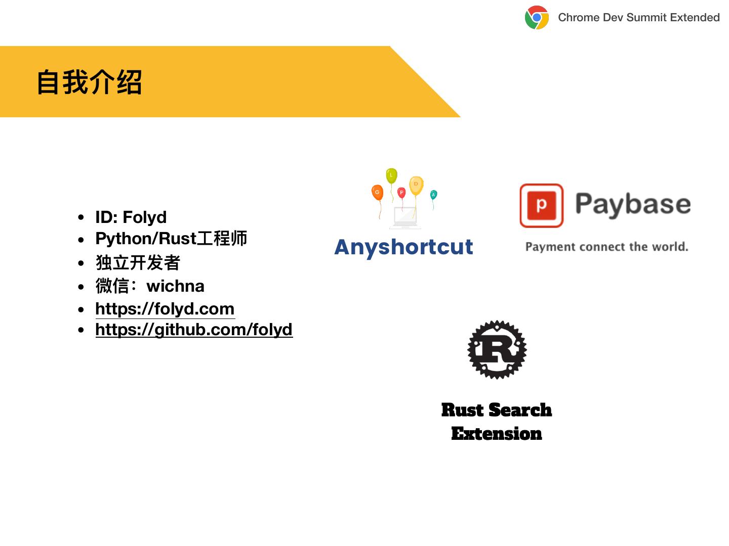 2 . Chrome Dev Summit Extended ⾃自我介绍 • ID: Folyd • Python/Rust⼯工程师 Anyshortcut • 独⽴立开发者 • 微信:wichna • https://folyd.com • https://github.com/folyd