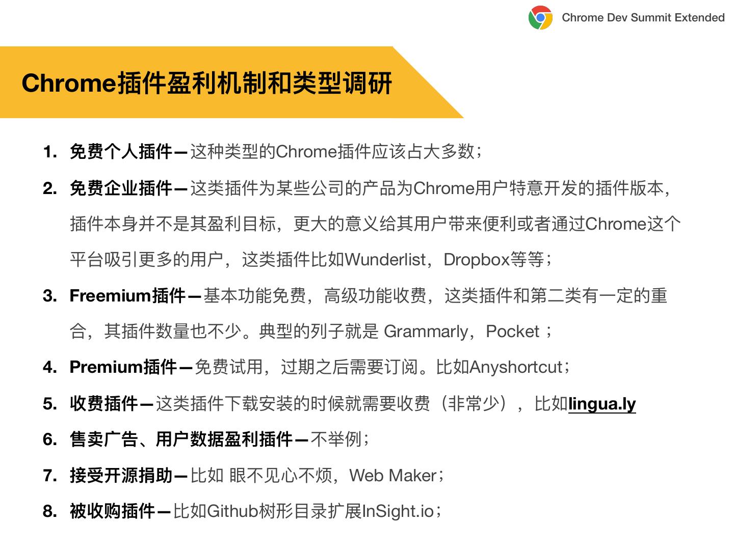 3 . Chrome Dev Summit Extended Chrome插件盈利利机制和类型调研 1. 免费个⼈人插件—这种类型的Chrome插件应该占⼤大多数; 2. 免费企业插件—这类插件为某些公司的产品为Chrome⽤用户特意开发的插件版本, 插件本身并不不是其盈利利⽬目标,更更⼤大的意义给其⽤用户带来便便利利或者通过Chrome这个 平台吸引更更多的⽤用户,这类插件⽐比如Wunderlist,Dropbox等等; 3. Freemium插件—基本功能免费,⾼高级功能收费,这类插件和第⼆二类有⼀一定的重 合,其插件数量量也不不少。典型的列列⼦子就是 Grammarly,Pocket ; 4. Premium插件—免费试⽤用,过期之后需要订阅。⽐比如Anyshortcut; 5. 收费插件—这类插件下载安装的时候就需要收费(⾮非常少),⽐比如lingua.ly 6. 售卖⼴广告、⽤用户数据盈利利插件—不不举例例; 7. 接受开源捐助—⽐比如 眼不不⻅见⼼心不不烦,Web Maker; 8. 被收购插件—⽐比如Github树形⽬目录扩展InSight.io;