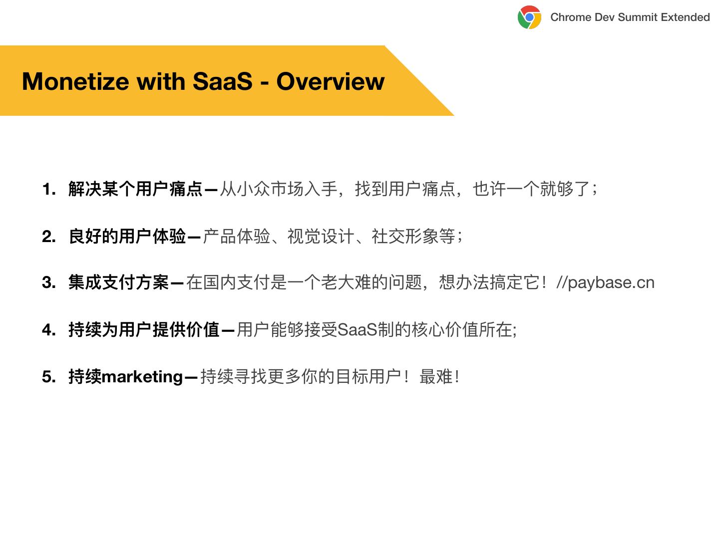 4 . Chrome Dev Summit Extended Monetize with SaaS - Overview 1. 解决某个⽤用户痛点—从⼩小众市场⼊入⼿手,找到⽤用户痛点,也许⼀一个就够了了; 2. 良好的⽤用户体验—产品体验、视觉设计、社交形象等; 3. 集成⽀支付⽅方案—在国内⽀支付是⼀一个⽼老老⼤大难的问题,想办法搞定它!//paybase.cn 4. 持续为⽤用户提供价值—⽤用户能够接受SaaS制的核⼼心价值所在; 5. 持续marketing—持续寻找更更多你的⽬目标⽤用户!最难!