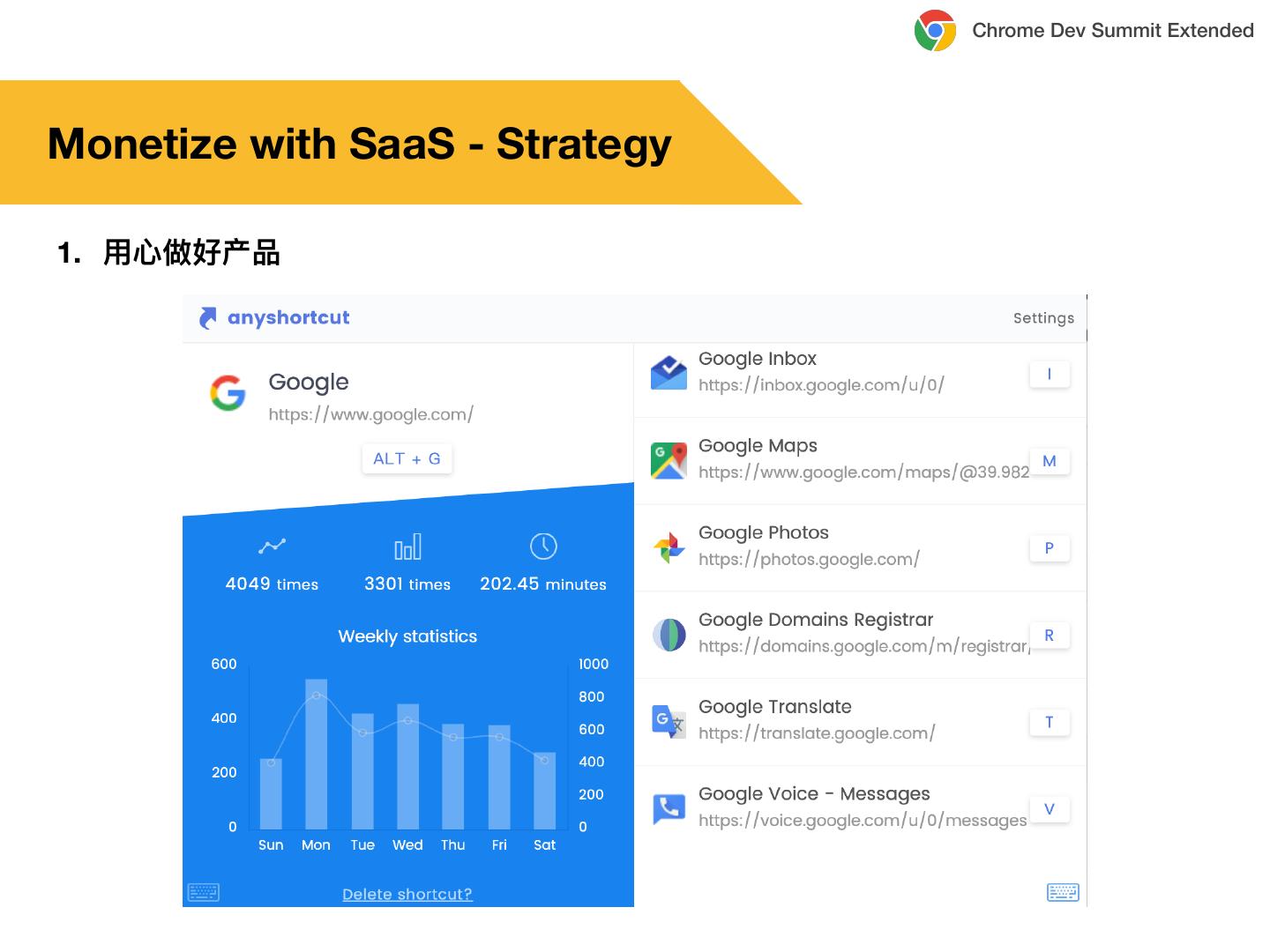 5 . Chrome Dev Summit Extended Monetize with SaaS - Strategy 1. ⽤用⼼心做好产品