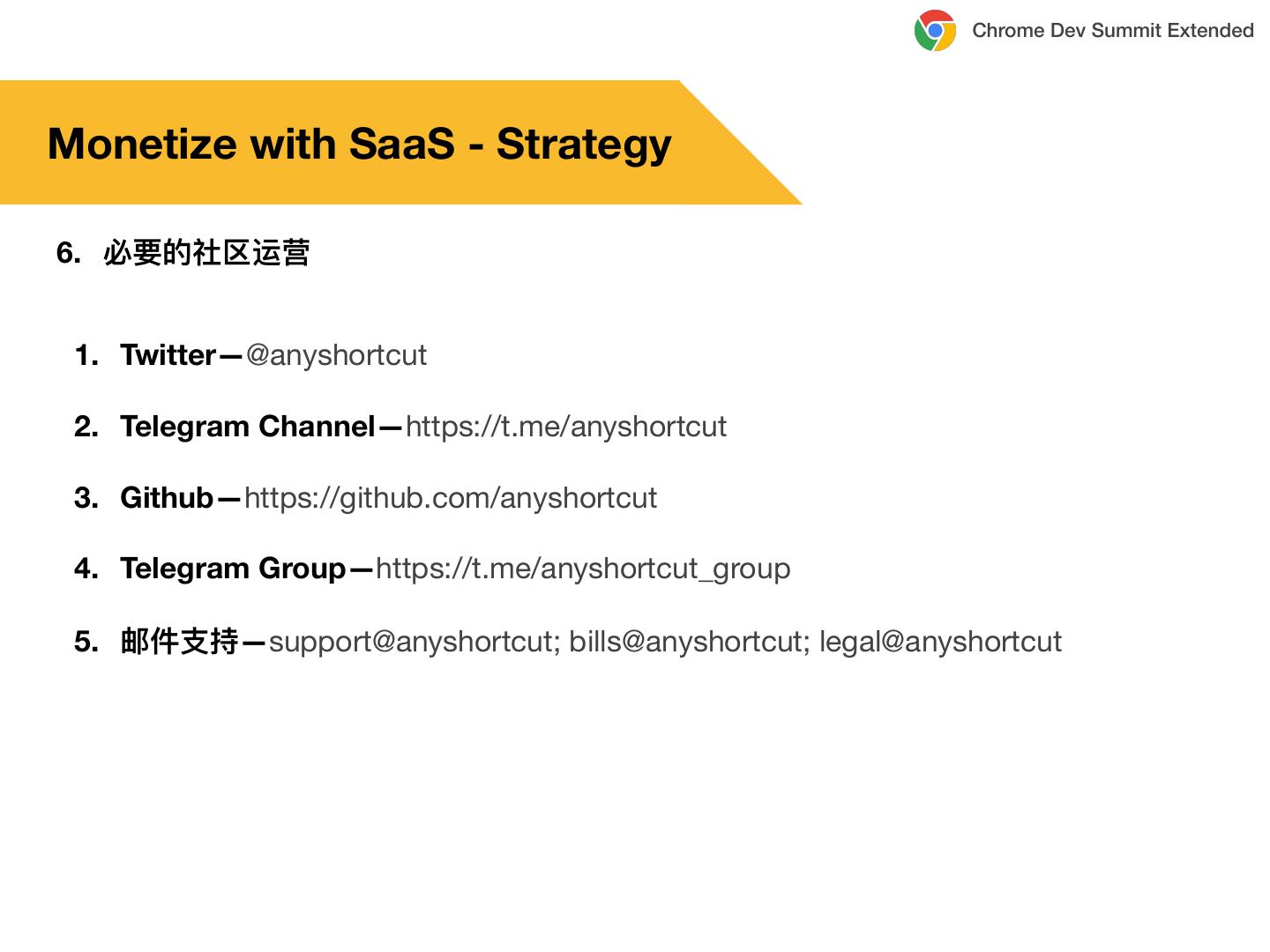 11 . Chrome Dev Summit Extended Monetize with SaaS - Strategy 6. 必要的社区运营 1. Twitter—@anyshortcut 2. Telegram Channel—https://t.me/anyshortcut 3. Github—https://github.com/anyshortcut 4. Telegram Group—https://t.me/anyshortcut_group 5. 邮件⽀支持—support@anyshortcut; bills@anyshortcut; legal@anyshortcut