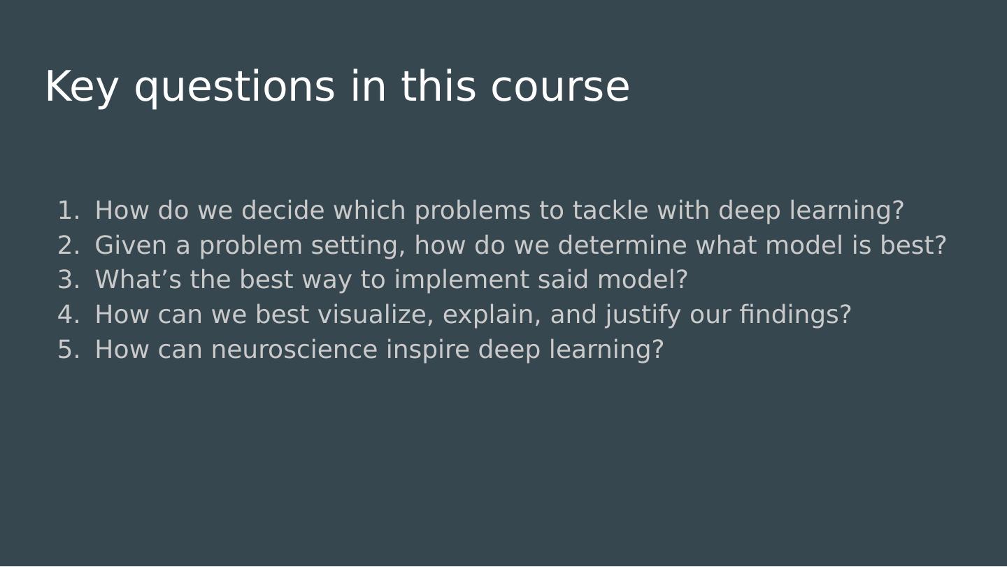 14 .Key questions in this course How do we decide which problems to tackle with deep learning? Given a problem setting, how do we determine what model is best? What’s the best way to implement said model? How can we best visualize, explain, and justify our findings? How can neuroscience inspire deep learning?
