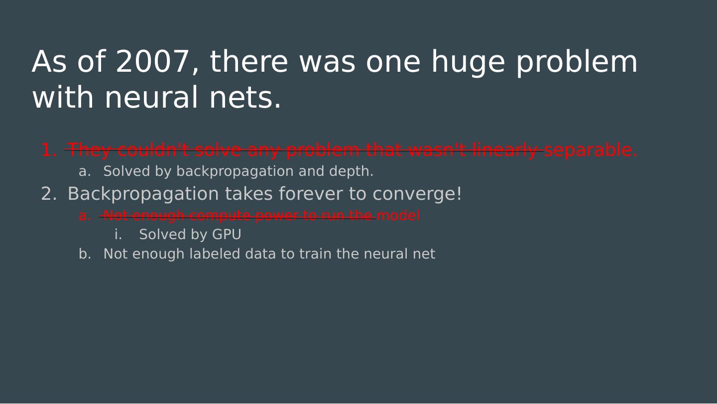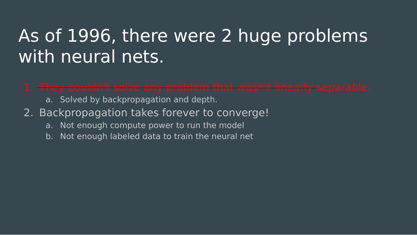 18 .As of 1996, there were 2 huge problems with neural nets. They couldnt solve any problem that wasnt linearly separable. Solved by backpropagation and depth. Backpropagation takes forever to converge! Not enough compute power to run the model Not enough labeled data to train the neural net