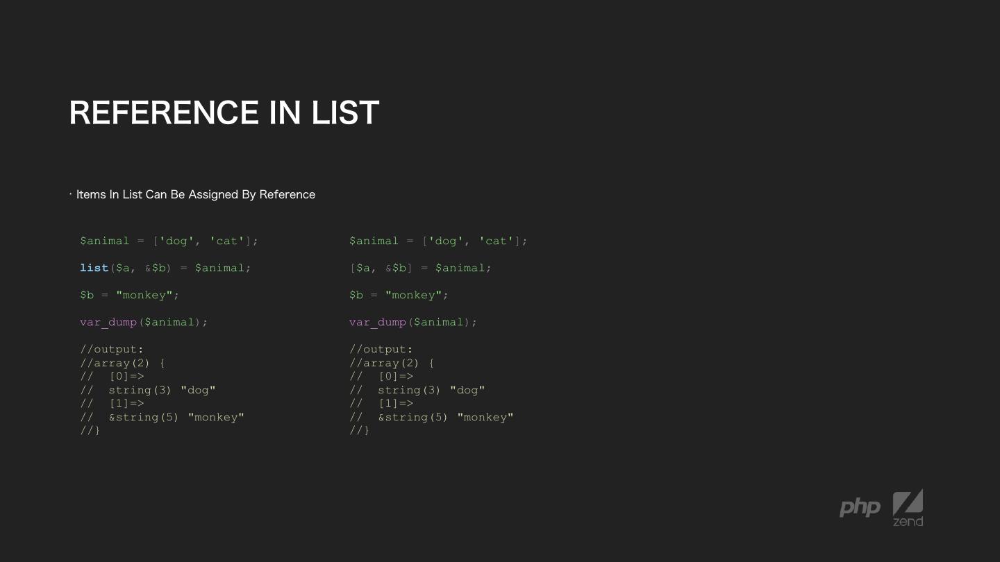 6 .REFERENCE IN LIST ・ Items In List Can Be Assigned By Reference $animal = ['dog', 'cat']; $animal = ['dog', 'cat']; list($a, &$b) = $animal; [$a, &$b] = $animal; $b = "monkey"; $b = "monkey"; var_dump($animal); var_dump($animal); //output: //output: //array(2) { //array(2) { // [0]=> // [0]=> // string(3) "dog" // string(3) "dog" // [1]=> // [1]=> // &string(5) "monkey" // &string(5) "monkey" //} //}