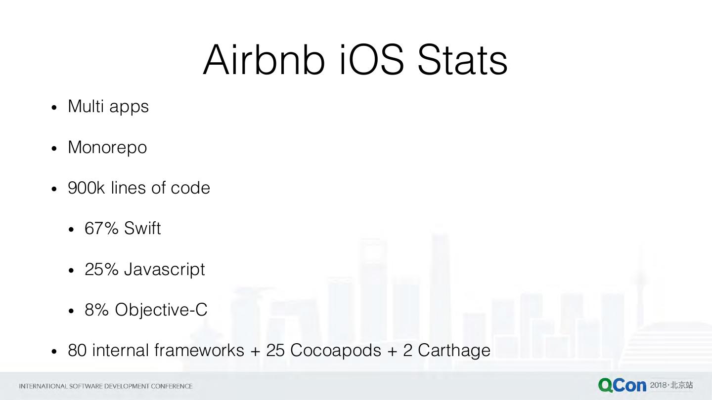 3 . Airbnb iOS Stats • Multi apps • Monorepo • 900k lines of code • 67% Swift • 25% Javascript • 8% Objective-C • 80 internal frameworks + 25 Cocoapods + 2 Carthage