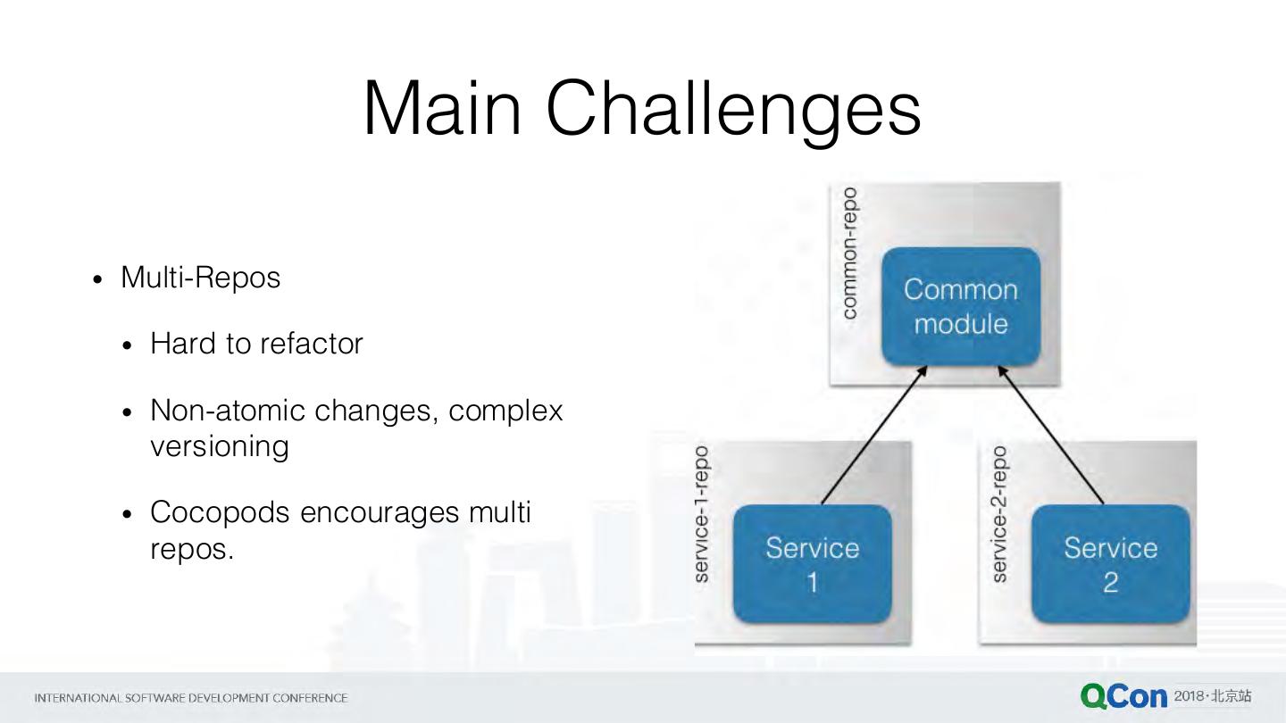 4 . Main Challenges • Multi-Repos • Hard to refactor • Non-atomic changes, complex versioning • Cocopods encourages multi repos.