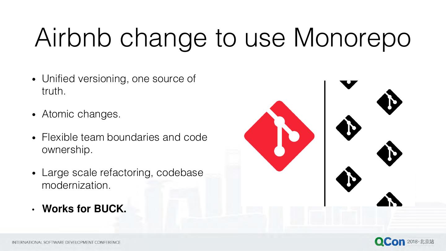 6 . Airbnb change to use Monorepo • Unified versioning, one source of truth. • Atomic changes. • Flexible team boundaries and code ownership. • Large scale refactoring, codebase modernization. • Works for BUCK.