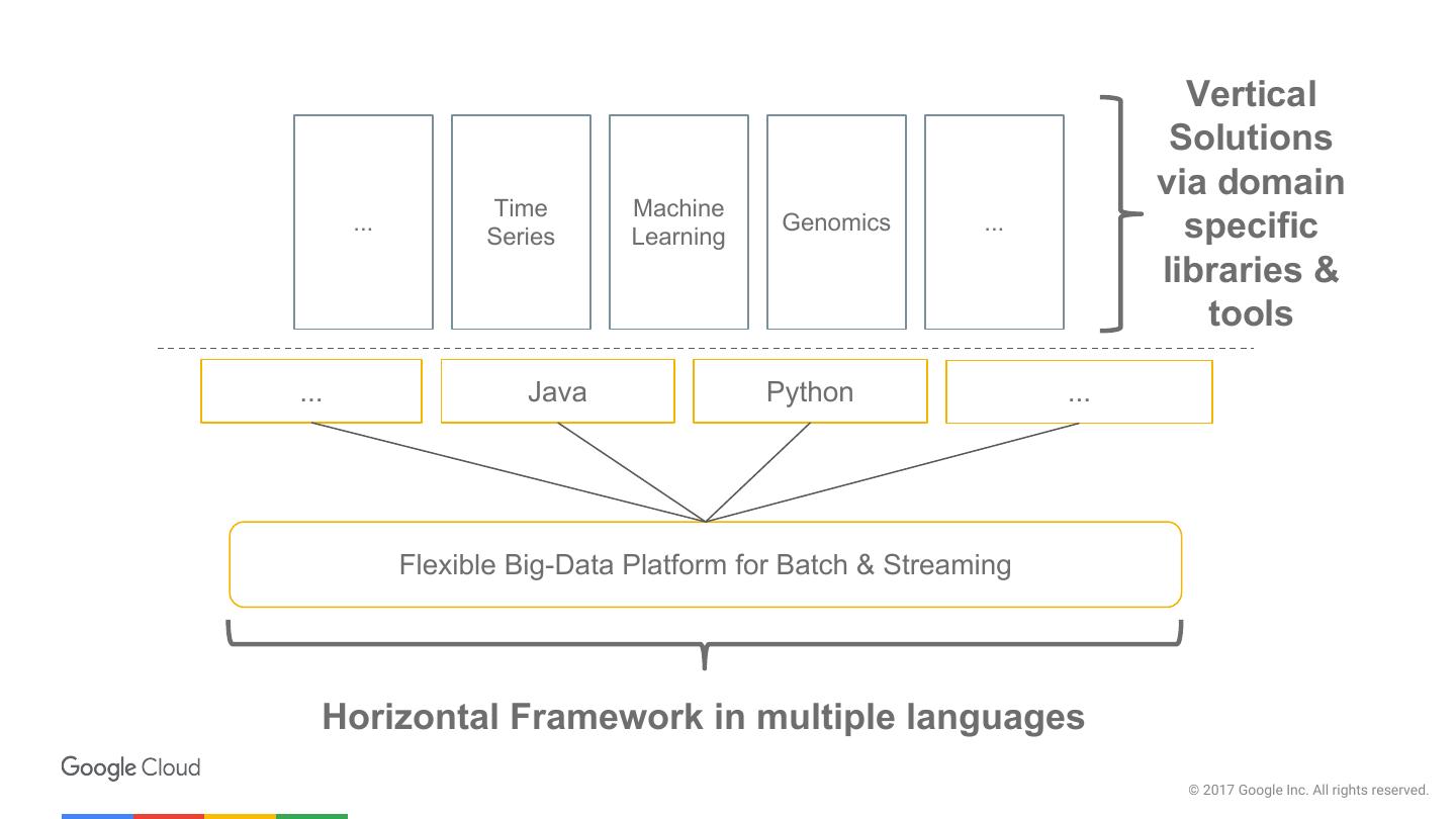 3 . Vertical Solutions via domain Time Machine ... Series Learning Genomics ... specific libraries & tools ... Java Python ... Flexible Big-Data Platform for Batch & Streaming Horizontal Framework in multiple languages © 2017 Google Inc. All rights reserved.