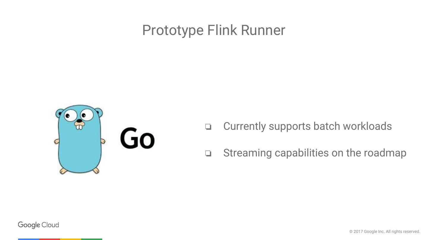 8 .Prototype Flink Runner ❏ Currently supports batch workloads ❏ Streaming capabilities on the roadmap © 2017 Google Inc. All rights reserved.