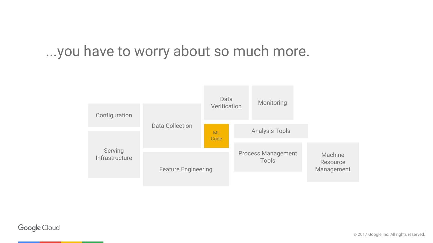 13 ....you have to worry about so much more. Data Monitoring Verification Configuration Data Collection ML Analysis Tools Code Cod Serving Process Management Machine Infrastructure Tools Resource Feature Engineering Management © 2017 Google Inc. All rights reserved.