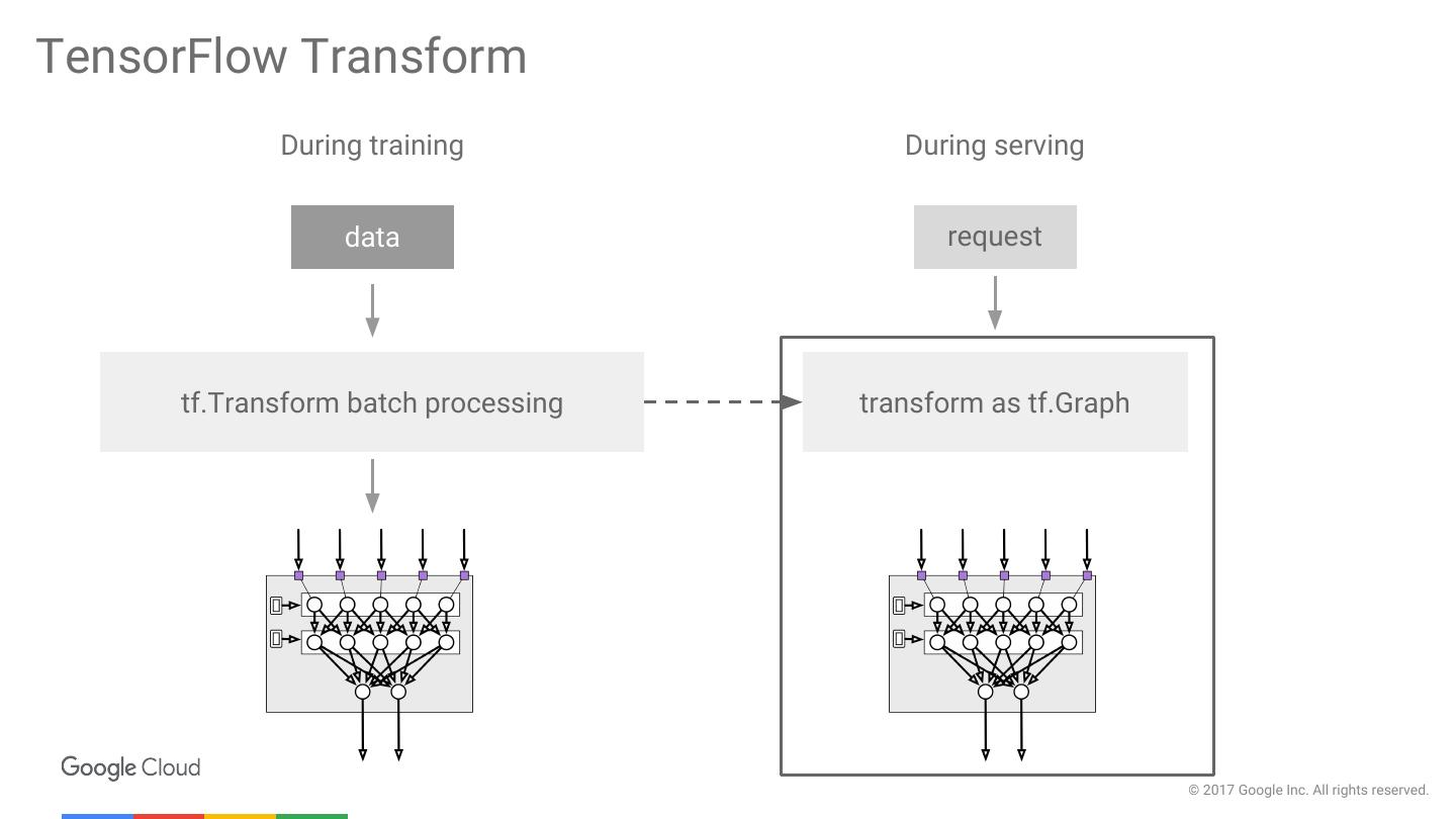 17 .TensorFlow Transform During training During serving data request tf.Transform batch processing transform as tf.Graph © 2017 Google Inc. All rights reserved.