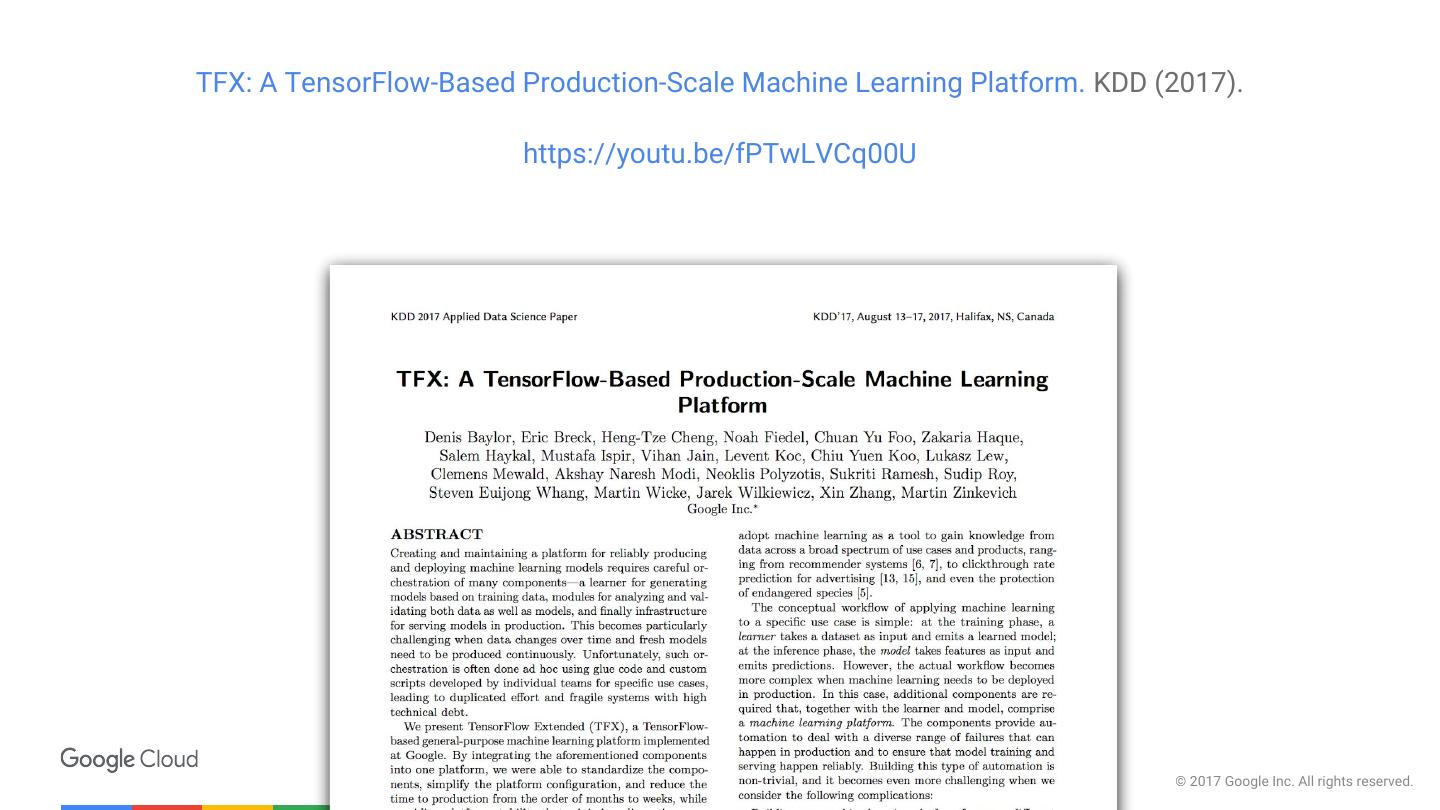 27 .TFX: A TensorFlow-Based Production-Scale Machine Learning Platform. KDD (2017). https://youtu.be/fPTwLVCq00U © 2017 Google Inc. All rights reserved.