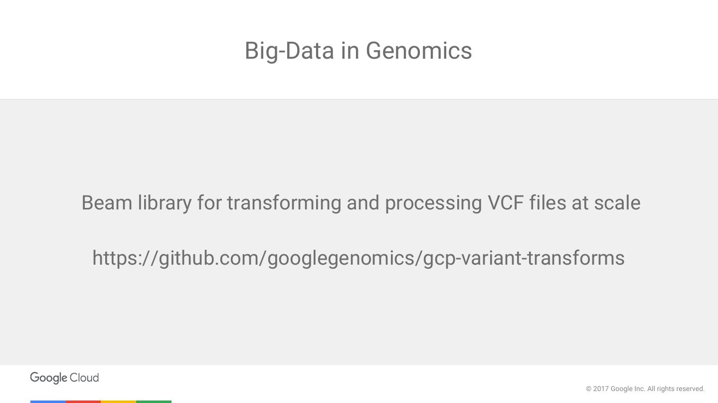 28 . Big-Data in Genomics Beam library for transforming and processing VCF files at scale https://github.com/googlegenomics/gcp-variant-transforms © 2017 Google Inc. All rights reserved.