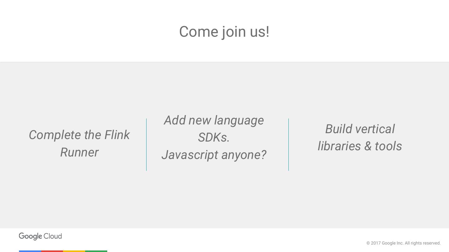29 . Come join us! Add new language Complete the Flink Build vertical SDKs. Runner libraries & tools Javascript anyone? © 2017 Google Inc. All rights reserved.