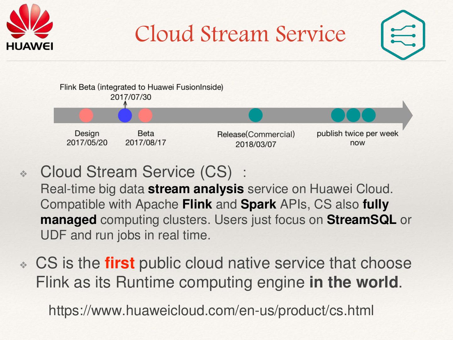 5 . Cloud Stream Service ❖ Cloud Stream Service (CS) : Real-time big data stream analysis service on Huawei Cloud. Compatible with Apache Flink and Spark APIs, CS also fully managed computing clusters. Users just focus on StreamSQL or UDF and run jobs in real time. ❖ CS is the first public cloud native service that choose Flink as its Runtime computing engine in the world. https://www.huaweicloud.com/en-us/product/cs.html