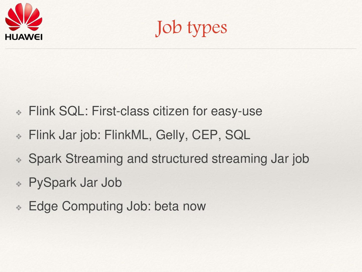 9 . Job types ❖ Flink SQL: First-class citizen for easy-use ❖ Flink Jar job: FlinkML, Gelly, CEP, SQL ❖ Spark Streaming and structured streaming Jar job ❖ PySpark Jar Job ❖ Edge Computing Job: beta now