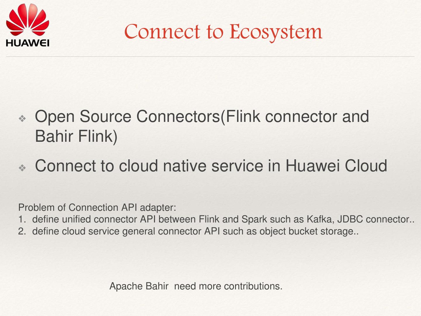 10 . Connect to Ecosystem ❖ Open Source Connectors(Flink connector and Bahir Flink) ❖ Connect to cloud native service in Huawei Cloud Problem of Connection API adapter: 1. define unified connector API between Flink and Spark such as Kafka, JDBC connector.. 2. define cloud service general connector API such as object bucket storage.. Apache Bahir need more contributions.