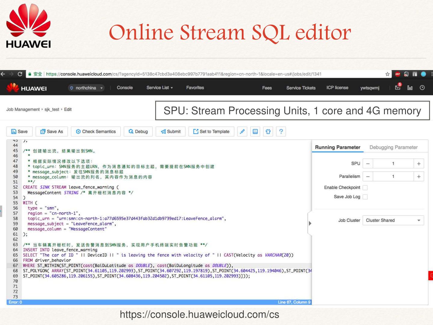 11 .Online Stream SQL editor SPU: Stream Processing Units, 1 core and 4G memory https://console.huaweicloud.com/cs