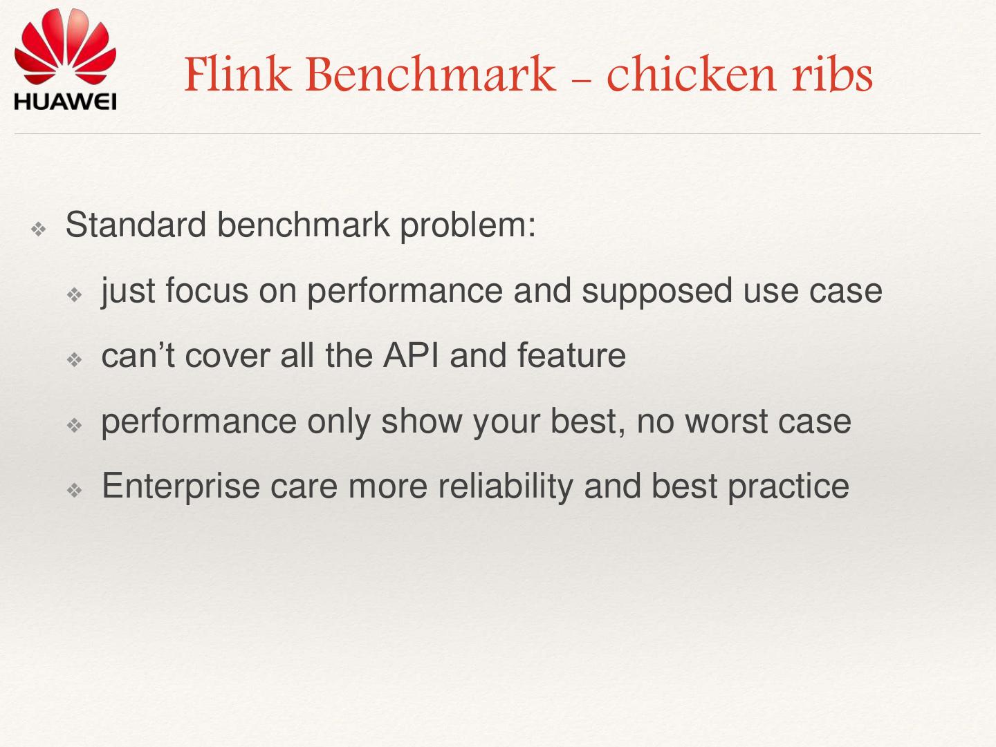 13 . Flink Benchmark - chicken ribs ❖ Standard benchmark problem: ❖ just focus on performance and supposed use case ❖ can’t cover all the API and feature ❖ performance only show your best, no worst case ❖ Enterprise care more reliability and best practice