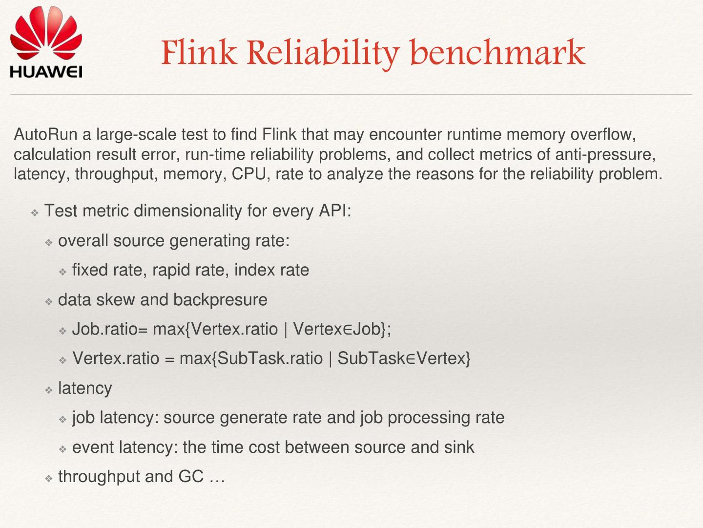 14 . Flink Reliability benchmark AutoRun a large-scale test to find Flink that may encounter runtime memory overflow, calculation result error, run-time reliability problems, and collect metrics of anti-pressure, latency, throughput, memory, CPU, rate to analyze the reasons for the reliability problem. ❖ Test metric dimensionality for every API: ❖ overall source generating rate: ❖ fixed rate, rapid rate, index rate ❖ data skew and backpresure ❖ Job.ratio= max{Vertex.ratio | Vertex∈Job}; ❖ Vertex.ratio = max{SubTask.ratio | SubTask∈Vertex} ❖ latency ❖ job latency: source generate rate and job processing rate ❖ event latency: the time cost between source and sink ❖ throughput and GC …