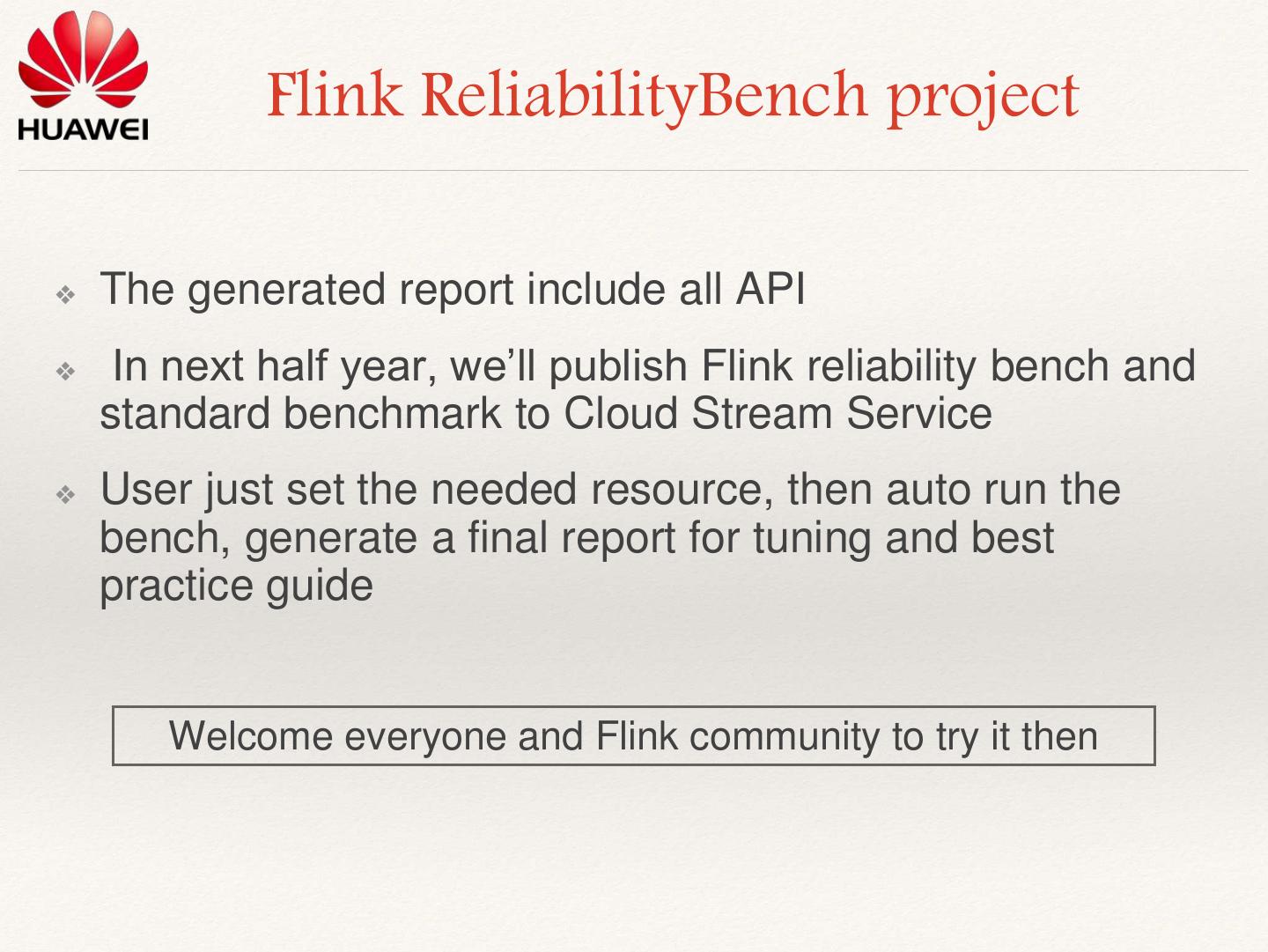 15 . Flink ReliabilityBench project ❖ The generated report include all API ❖ In next half year, we’ll publish Flink reliability bench and standard benchmark to Cloud Stream Service ❖ User just set the needed resource, then auto run the bench, generate a final report for tuning and best practice guide Welcome everyone and Flink community to try it then
