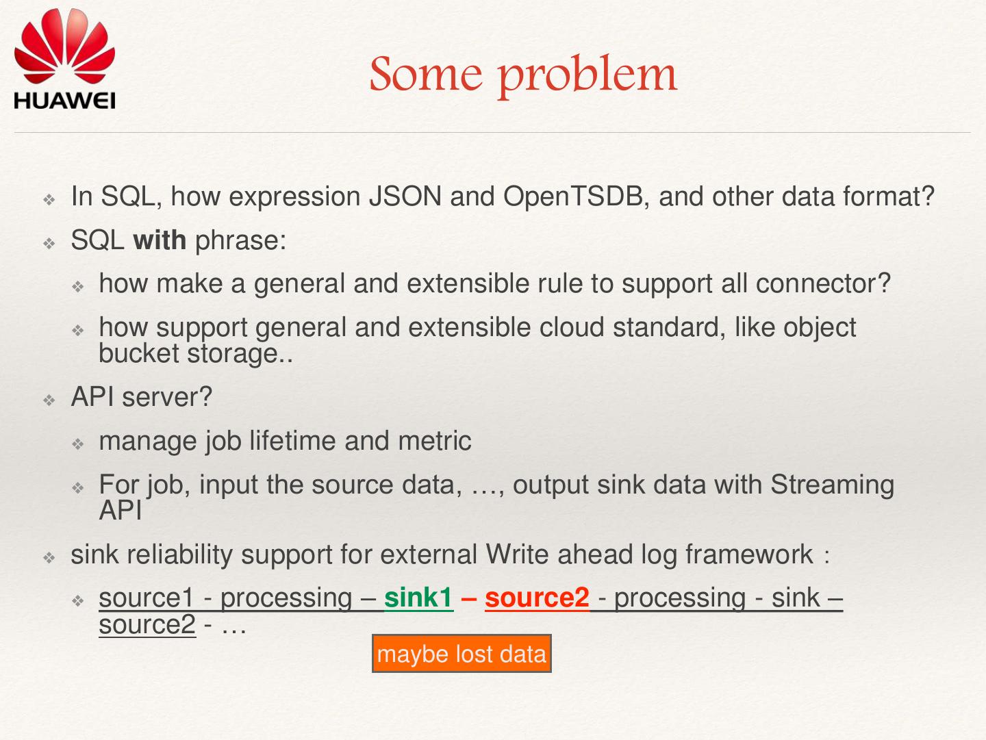 16 . Some problem ❖ In SQL, how expression JSON and OpenTSDB, and other data format? ❖ SQL with phrase: ❖ how make a general and extensible rule to support all connector? ❖ how support general and extensible cloud standard, like object bucket storage.. ❖ API server? ❖ manage job lifetime and metric ❖ For job, input the source data, …, output sink data with Streaming API ❖ sink reliability support for external Write ahead log framework: ❖ source1 - processing – sink1 – source2 - processing - sink – source2 - … maybe lost data