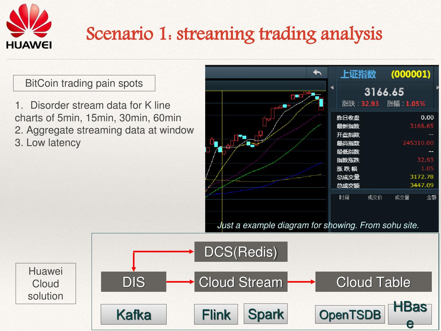 18 . Scenario 1: streaming trading analysis BitCoin trading pain spots 1. Disorder stream data for K line charts of 5min, 15min, 30min, 60min 2. Aggregate streaming data at window 3. Low latency Just a example diagram for showing. From sohu site. DCS(Redis) Huawei Cloud DIS Cloud Stream Cloud Table solution HBas Kafka Flink Spark OpenTSDB e