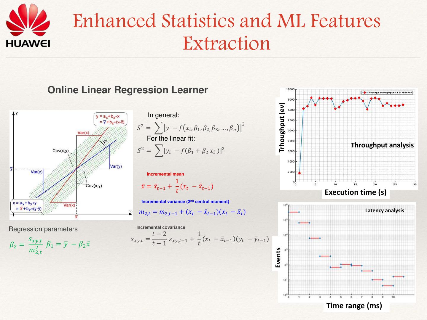 21 . Enhanced Statistics and ML Features Extraction Online Linear Regression Learner Trhoughput (ev) In general: 2 𝑆2 = 𝑦 − 𝑓 𝑥𝑖 , 𝛽1 , 𝛽2, 𝛽3 , … , 𝛽𝑛 For the linear fit: Throughput analysis 𝑆2 = 𝑦𝑖 − 𝑓 𝛽1 + 𝛽2 𝑥𝑖 2 Incremental mean 1 𝑥 = 𝑥𝑡−1 + (𝑥 − 𝑥𝑡−1 ) 𝑡 𝑡 Execution time (s) Incremental variance (2nd central moment) 𝑚2,𝑡 = 𝑚2,𝑡−1 + (𝑥𝑡 − 𝑥𝑡−1 )(𝑥𝑡 − 𝑥𝑡 ) Latency analysis Incremental covariance Regression parameters 𝑡−2 1 𝑠𝑥𝑦,𝑡 𝑠𝑥𝑦,𝑡 = 𝑠𝑥𝑦,𝑡−1 + 𝑥 − 𝑥𝑡−1 𝑦𝑡 − 𝑦𝑡−1 𝛽2 = 2 𝛽1 = 𝑦 − 𝛽2 𝑥 𝑡−1 𝑡 𝑡 𝑚2,𝑡 Events Time range (ms)