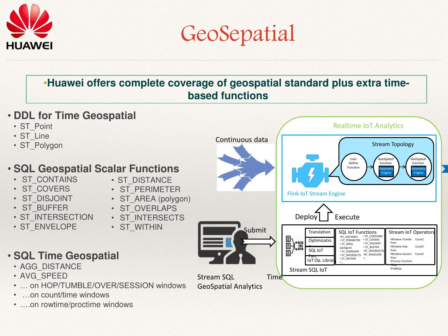 22 . GeoSepatial •Huawei offers complete coverage of geospatial standard plus extra time- based functions • DDL for Time Geospatial • ST_Point Realtime IoT Analytics • ST_Line Continuous data • ST_Polygon Stream Topology User GeoSpatial GeoSpatial Define function function • SQL Geospatial Scalar Functions Function Geometry Engine Geometry Engine • ST_CONTAINS • ST_DISTANCE • ST_COVERS • ST_PERIMETER Flink IoT Stream Engine • ST_DISJOINT • ST_AREA (polygon) • ST_BUFFER • ST_OVERLAPS • ST_INTERSECTION • ST_INTERSECTS Deploy Execute • ST_ENVELOPE • ST_WITHIN Submit Translation SQL IoT Functions Stream IoT Operators •ST_DISTANCE • ST_CONTAINS • ST_COVERS •Window Tumble Count/ Optimizatio • ST_PERIMETER • ST_DISJOINT Time • ST_AREA n (polygon) • ST_BUFFER •Window Hop Count/ SQL IoT • ST_OVERLAPS •ST_INTERSECTION Time • SQL Time Geospatial Fun. IoT Op. Library • ST_INTERSECTS • ST_WITHIN •… •ST_ENVELOPE •… •Window Session Count/ Time •Process Function • AGG_DISTANCE Stream SQL IoT •Map •FlatMap • AVG_SPEED Stream SQL Time • … on HOP/TUMBLE/OVER/SESSION windows GeoSpatial Analytics • …on count/time windows • ….on rowtime/proctime windows