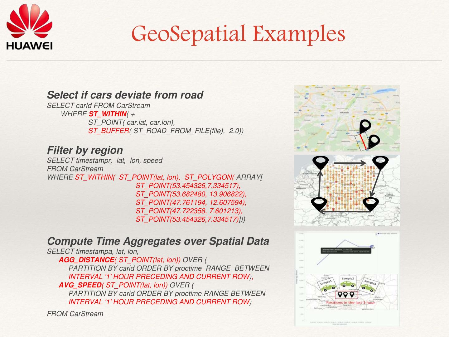 23 . GeoSepatial Examples Select if cars deviate from road SELECT carId FROM CarStream WHERE ST_WITHIN( + ST_POINT( car.lat, car.lon), ST_BUFFER( ST_ROAD_FROM_FILE(file), 2.0)) Filter by region SELECT timestampr, lat, lon, speed FROM CarStream WHERE ST_WITHIN( ST_POINT(lat, lon), ST_POLYGON( ARRAY[ ST_POINT(53.454326,7.334517), ST_POINT(53.682480, 13.906822), ST_POINT(47.761194, 12.607594), ST_POINT(47.722358, 7.601213), ST_POINT(53.454326,7.334517)])) Compute Time Aggregates over Spatial Data SELECT timestampa, lat, lon, AGG_DISTANCE( ST_POINT(lat, lon)) OVER ( PARTITION BY carid ORDER BY proctime RANGE BETWEEN INTERVAL '1' HOUR PRECEDING AND CURRENT ROW), AVG_SPEED( ST_POINT(lat, lon)) OVER ( PARTITION BY carid ORDER BY proctime RANGE BETWEEN INTERVAL '1' HOUR PRECEDING AND CURRENT ROW) FROM CarStream