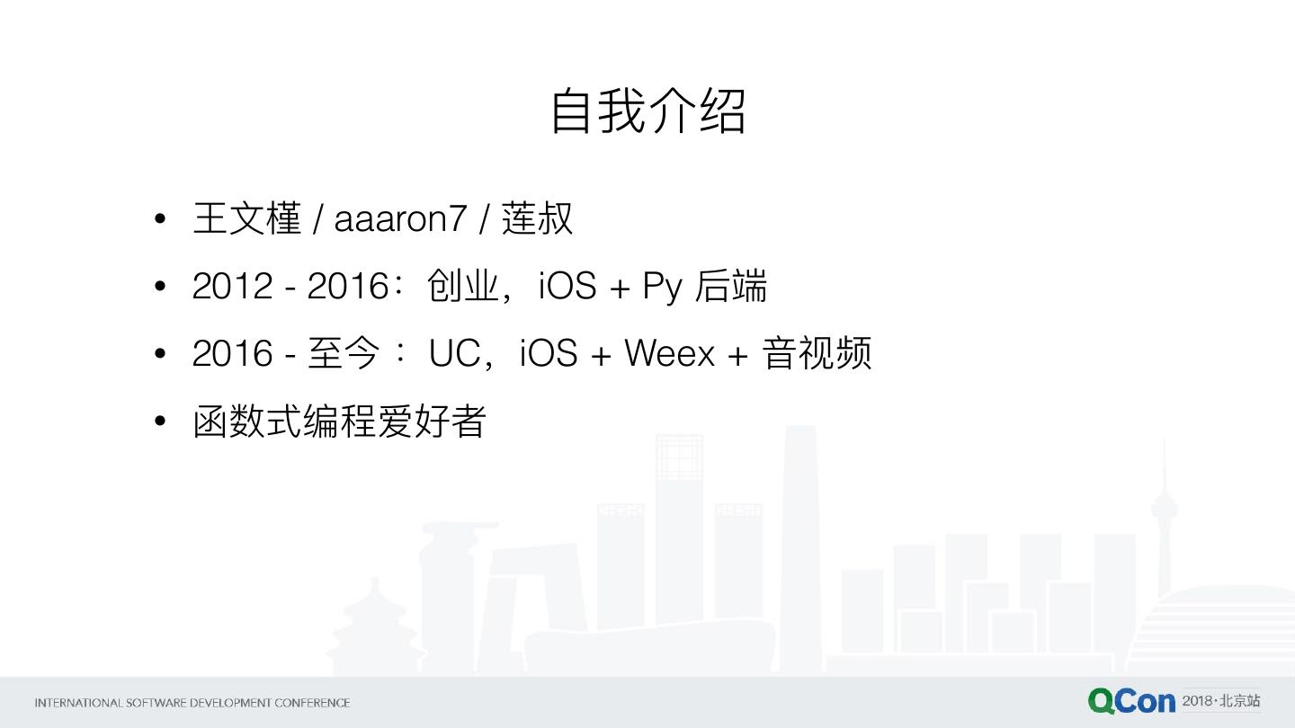 2 . ⾃自我介绍 • 王⽂文槿 / aaaron7 / 莲叔 • 2012 - 2016:创业,iOS + Py 后端 • 2016 - ⾄至今 :UC,iOS + Weex + ⾳音视频 • 函数式编程爱好者