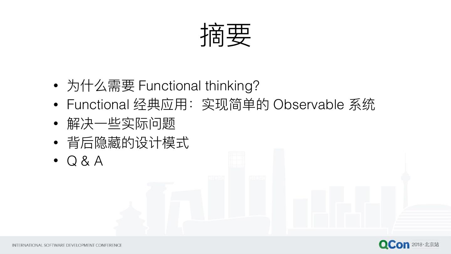 3 . 摘要 • 为什什么需要 Functional thinking? • Functional 经典应⽤用:实现简单的 Observable 系统 • 解决⼀一些实际问题 • 背后隐藏的设计模式 • Q&A