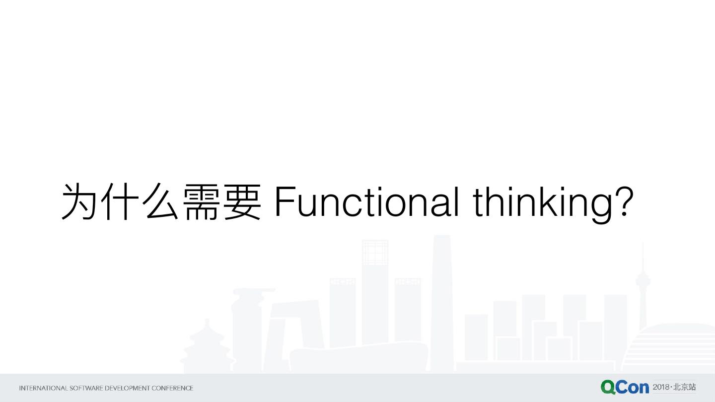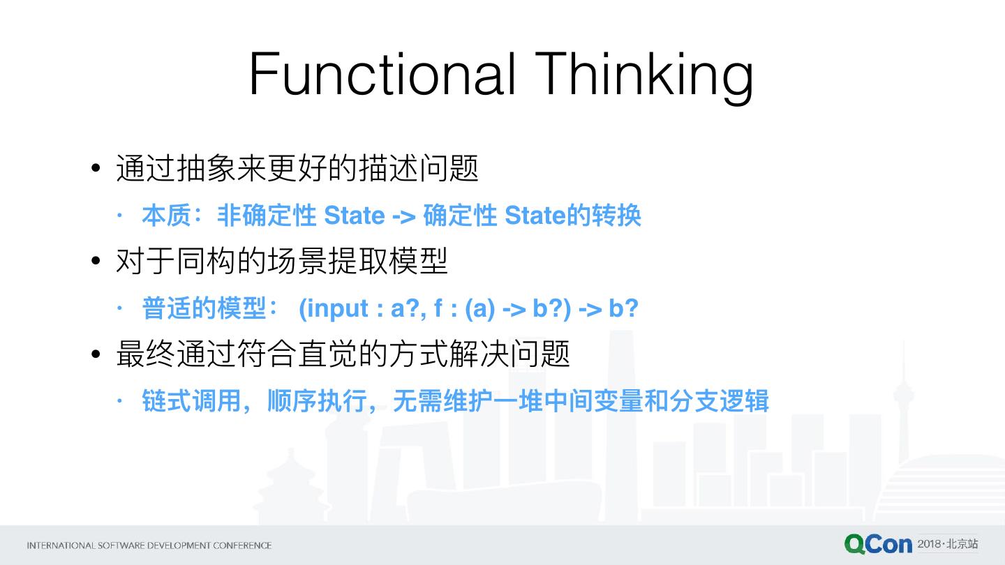 22 . Functional Thinking • 通过抽象来更更好的描述问题 • 本质:⾮非确定性 State -> 确定性 State的转换 • 对于同构的场景提取模型 • 普适的模型: (input : a?, f : (a) -> b?) -> b? • 最终通过符合直觉的⽅方式解决问题 • 链式调⽤用,顺序执⾏行行,⽆无需维护⼀一堆中间变量量和分⽀支逻辑