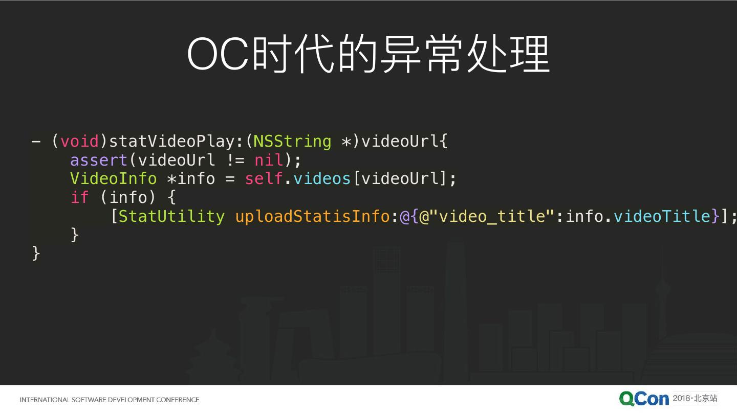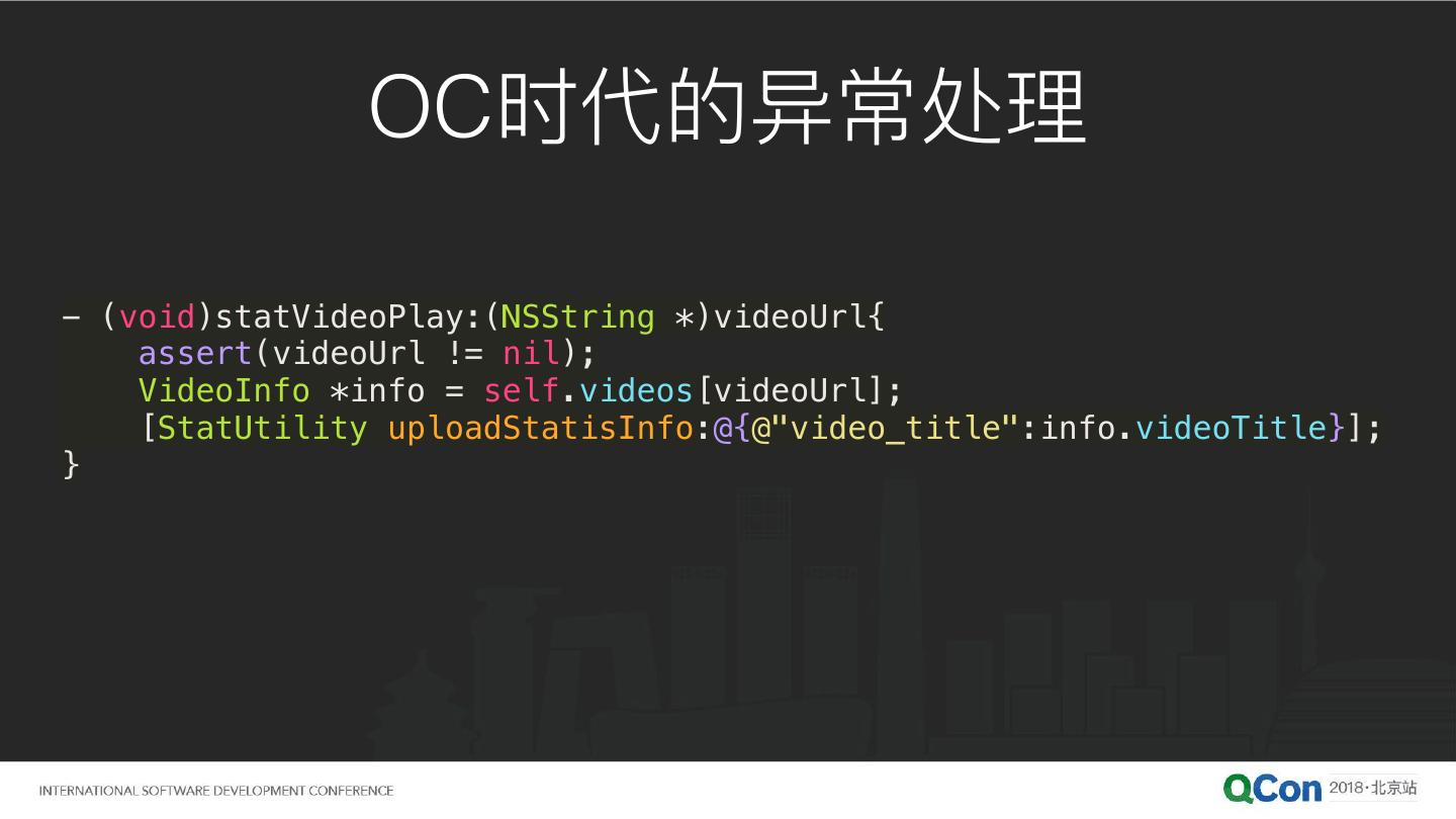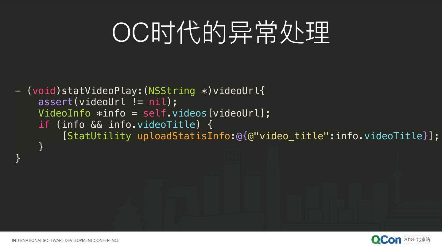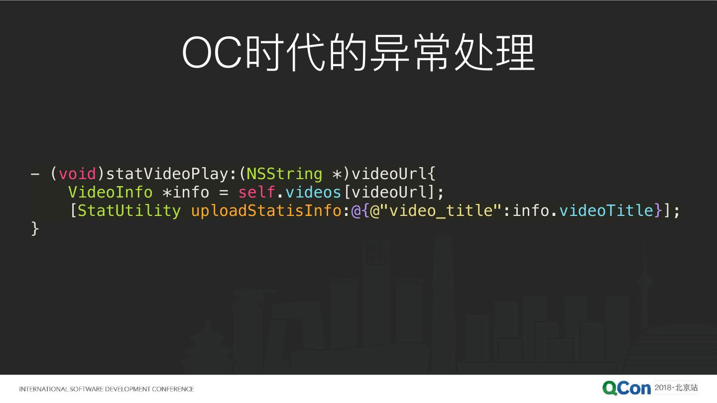 6 . OC时代的异常处理理 - (void)statVideoPlay:(NSString *)videoUrl{ VideoInfo *info = self.videos[videoUrl]; [StatUtility uploadStatisInfo:@{@"video_title":info.videoTitle}]; }