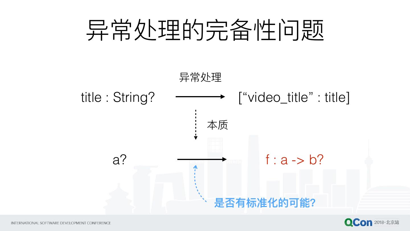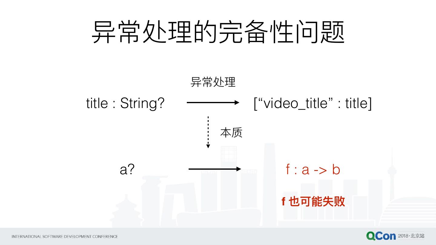 16 .异常处理理的完备性问题 异常处理理 title : String? [“video_title” : title] 本质 a? f : a -> b? 是否有标准化的可能?