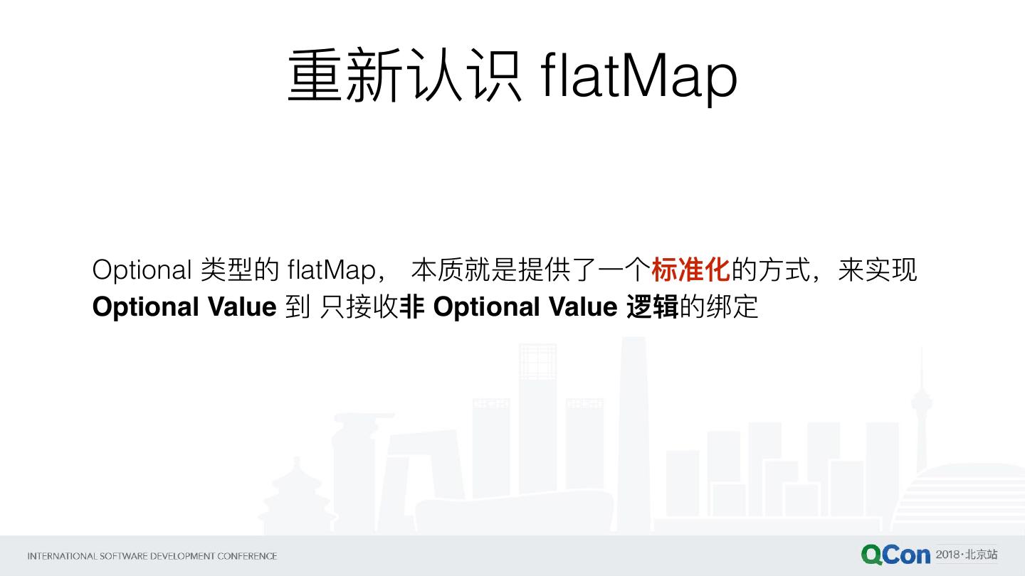 21 . 重新认识 flatMap Optional 类型的 flatMap, 本质就是提供了了⼀一个标准化的⽅方式,来实现 Optional Value 到 只接收⾮非 Optional Value 逻辑的绑定
