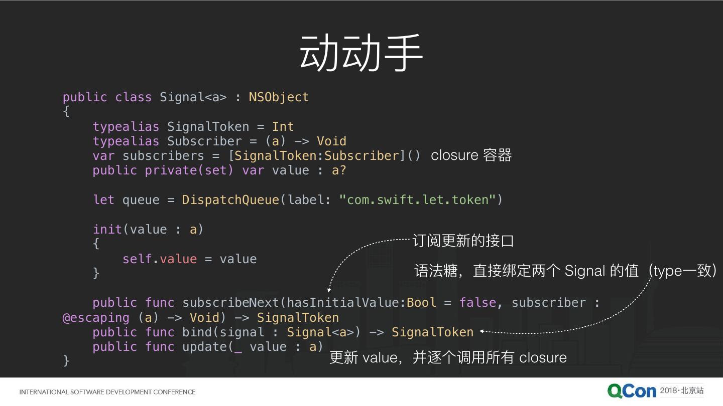28 . 动动⼿手 public class Signal<a> : NSObject { typealias SignalToken = Int typealias Subscriber = (a) -> Void var subscribers = [SignalToken:Subscriber]() closure 容器器 public private(set) var value : a? let queue = DispatchQueue(label: "com.swift.let.token") init(value : a) { 订阅更更新的接⼝口 self.value = value } 语法糖,直接绑定两个 Signal 的值(type⼀一致) public func subscribeNext(hasInitialValue:Bool = false, subscriber : @escaping (a) -> Void) -> SignalToken public func bind(signal : Signal<a>) -> SignalToken public func update(_ value : a) } 更更新 value,并逐个调⽤用所有 closure