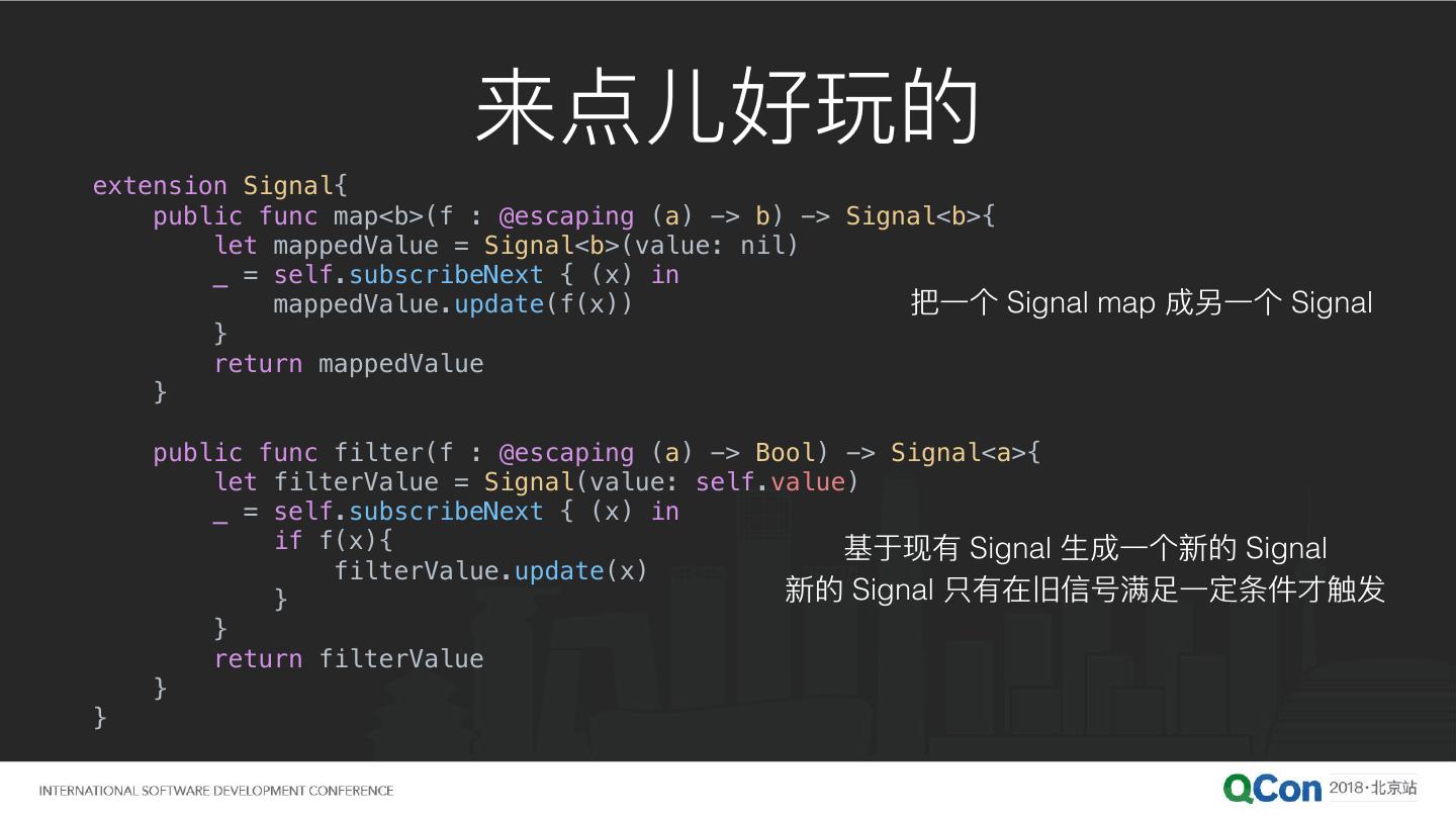 29 . Playground let xSignal = Signal(value: 0) let ySignal = Signal(value: 1) _ = xSignal.bind(signal: ySignal) _ = xSignal.subscribeNext { (x) in print("got \(x) in xsignal") } _ = ySignal.subscribeNext(subscriber: { (x) in print("got \(x) in ysignal”) }) xSignal.update(33) got 33 in xsignal got 33 in ysignal