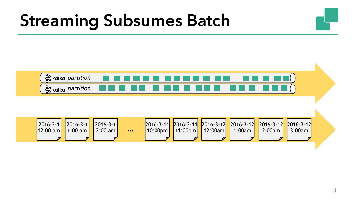 3 .Streaming Subsumes Batch partition partition 2016-3-1 2016-3-1 2016-3-1 2016-3-11 2016-3-11 2016-3-12 2016-3-12 2016-3-12 2016-3-12 12:00 am 1:00 am 2:00 am … 10:00pm 11:00pm 12:00am 1:00am 2:00am 3:00am 3