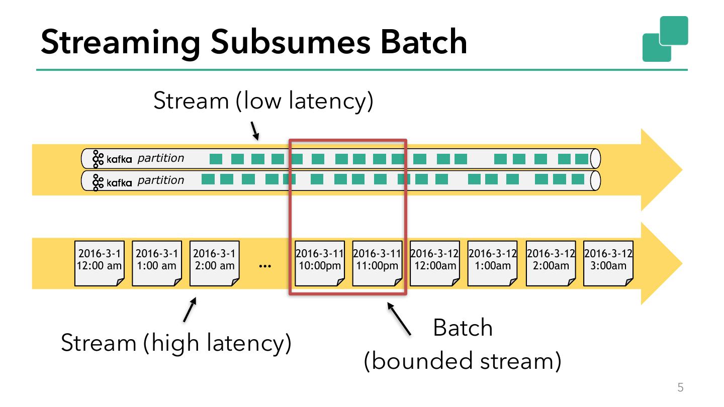 4 .Streaming Subsumes Batch Stream (low latency) partition partition 2016-3-1 2016-3-1 2016-3-1 2016-3-11 2016-3-11 2016-3-12 2016-3-12 2016-3-12 2016-3-12 12:00 am 1:00 am 2:00 am … 10:00pm 11:00pm 12:00am 1:00am 2:00am 3:00am Stream (high latency) 4