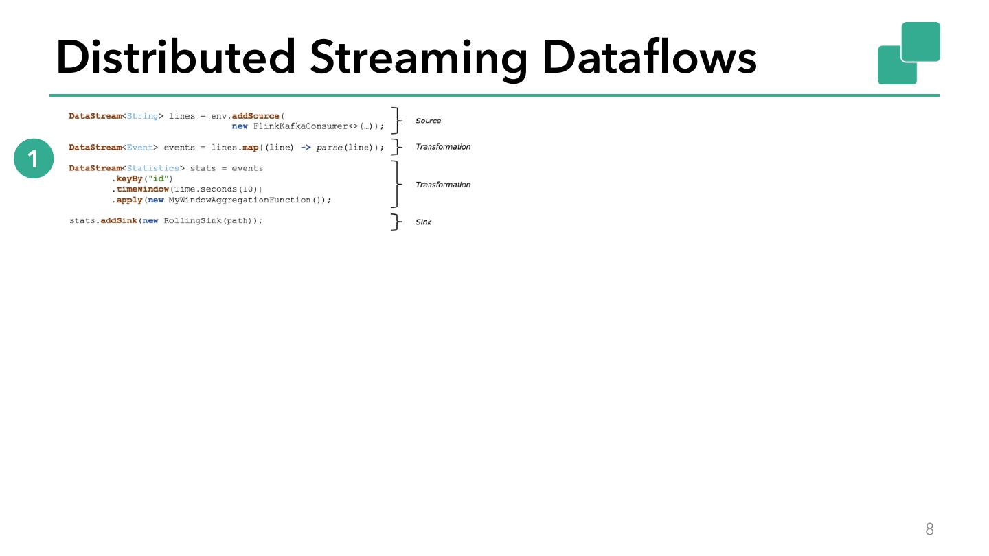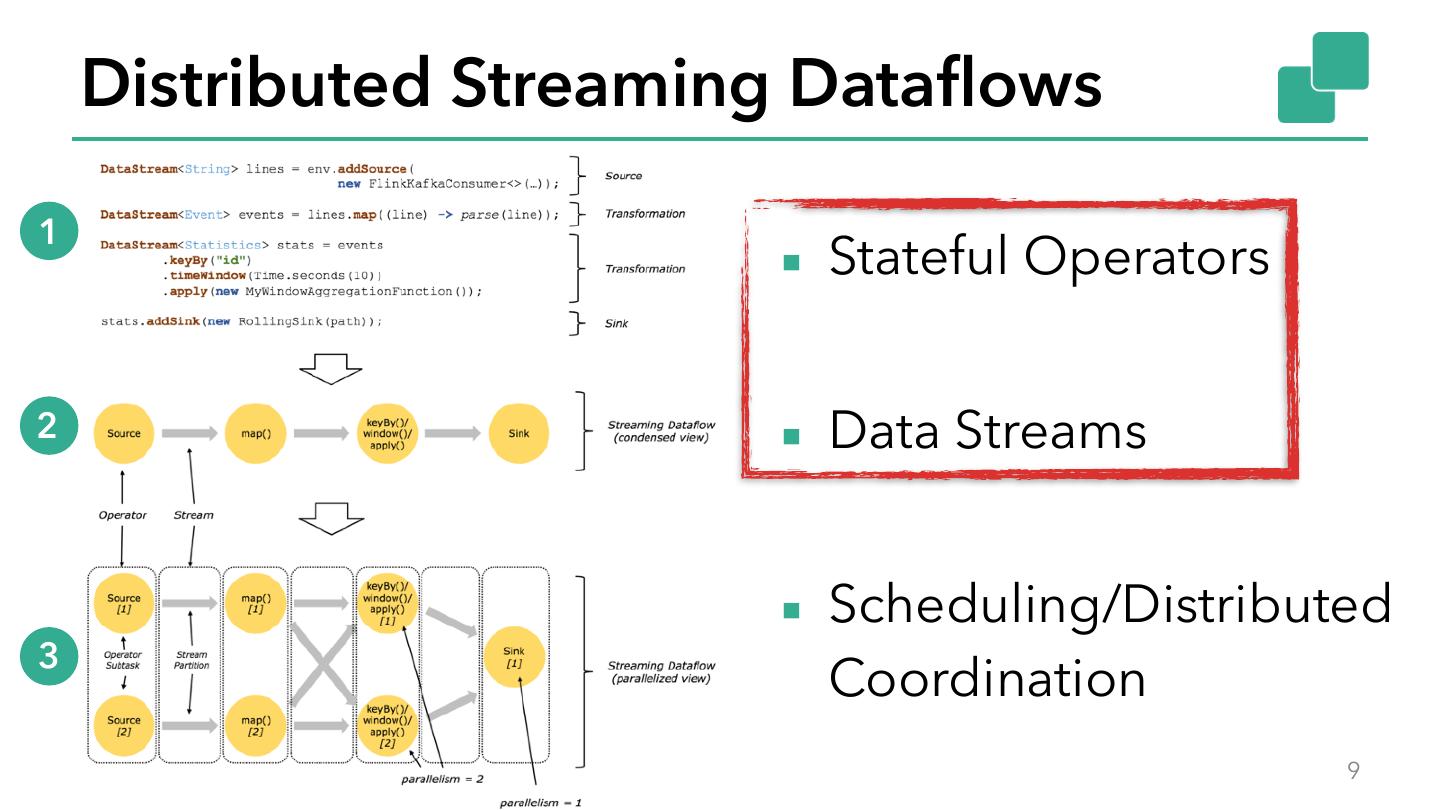 8 . Distributed Streaming Dataflows 1 ▪ Stateful Operators 2 ▪ Data Streams ▪ Scheduling/Distributed 3 Coordination 8